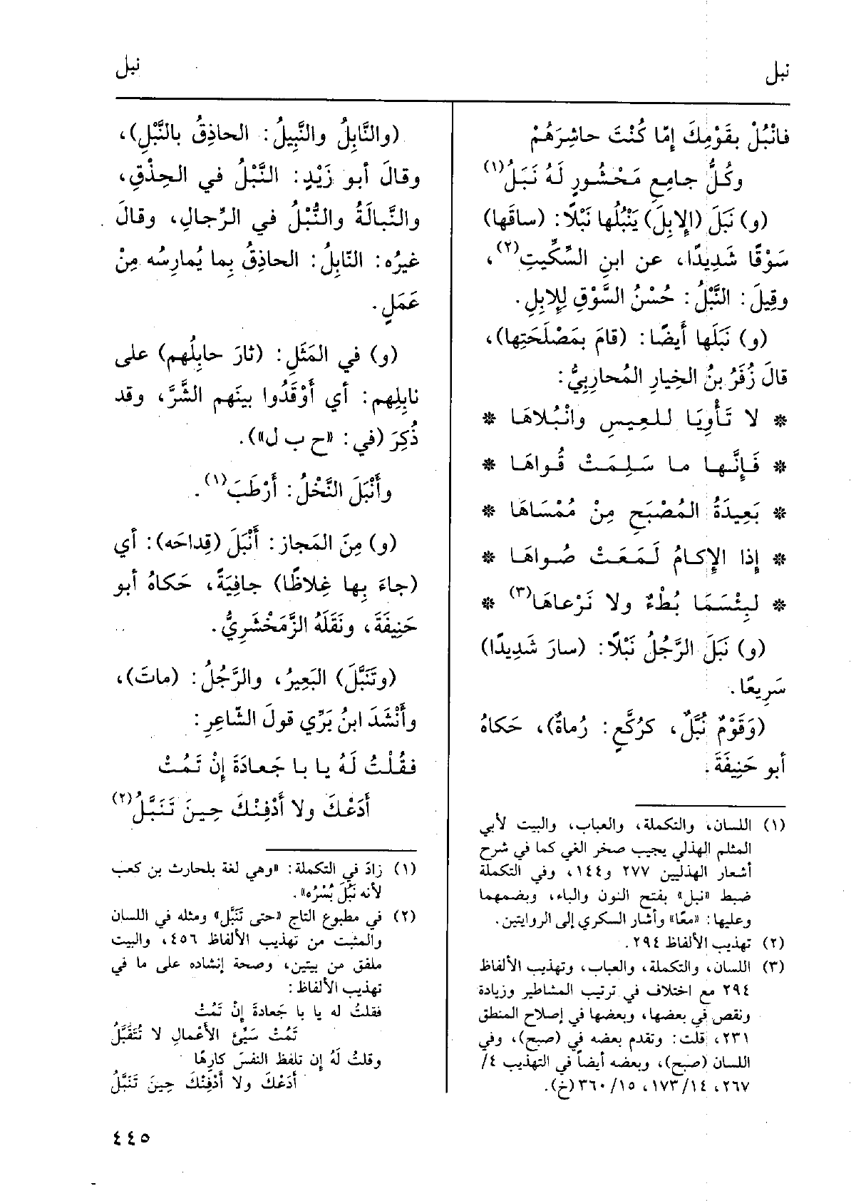 فإنَّها مَا سَلِمَتْ قُواها بعيدَةُ المُصْبَحِ مِنْ مُمْساها إِذا الإكامُ لَمَعَتْ صُواها لَبئسَما بُطءٌ وَلَا نَرْعَاها نَبَلَ الرَّجُلُ نَبْلاً: سارَ شَدِيدا، سَريعاً. وقَومٌ نُبَّلٌ، كرُكَّعٍ: رُماةٌ، حكاهُ أَبو حنيفَةَ. والنَّابِلُ والنَّبيلُ: الحاذِقُ بالنَّبْلِ، وَقَالَ أَبو زَيدٍ: النَّبْلُ فِي الحِذْقِ، والنَّبالَةُ والنُّبْلُ فِي الرِّجالِ، وَقَالَ غيرُه: النَّابِلُ: الحاذِقُ بِمَا يُمارِسُهُ من عَمَلٍ. فِي المَثَلِ: ثارَ حابِلُهُم على نابِلِهِم: أَي أَوقَدوا بَينهم الشَّرَّ، وَقد ذُكِرَ فِي حَبل. وأَنْبَلَ النَّخْلُ: أَرْطَبَ. منَ المَجاز: أَنْبَلَ قِداحَهُ: أَي جاءَ بهَا غِلاظاً جافِيَةً، حكاهُ أَبو حنيفَةَ، وَنَقله الزَّمَخْشَرِيُّ. وتَنَبَّلَ البَعيرُ، والرَجُلُ: ماتَ، وأَنشدَ ابنُ برِّيّ قولَ الشّاعِرِ:
