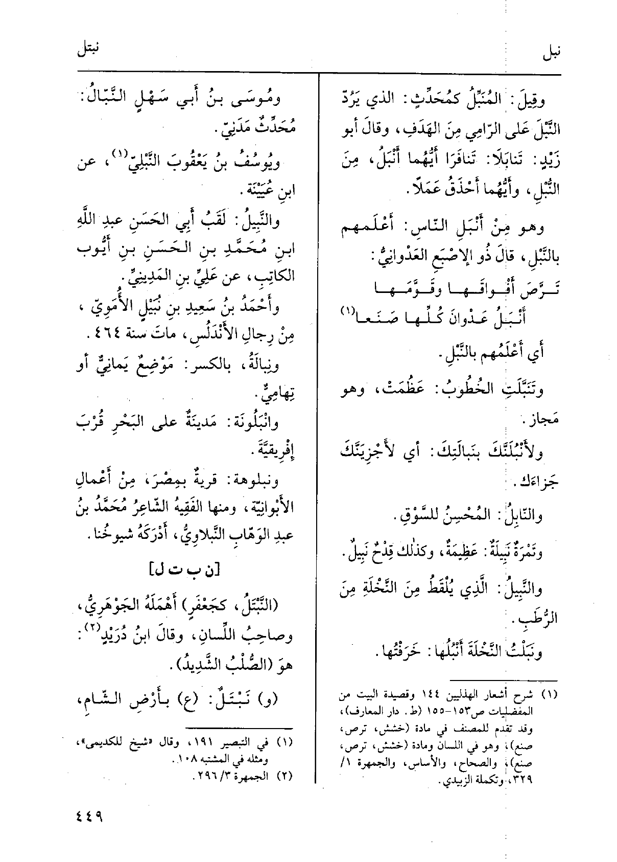 أَي أَعْلَمهم بالنَّبْل. وتنَبَّلَتِ الخُطوبُ: عَظُمَت، وَهُوَ مَجاز. ولأَنْبُلَنَّكَ بنَبالَتِك: أَي لأجزِيَنَّكَ) جَزاءَك. والنابِل: المُحسِنُ للسَّوْق. وَتَمْرةٌ نبيلَةٌ: عظيمةٌ، وَكَذَلِكَ قِدْحٌ نَبيلٌ. والنَّبيل: الَّذِي يُلقَطُ من النخلةِ من الرُّطَب. ونَبَلْتُ النخلةَ أَنْبُلُها: خَرَفْتُها. ومُوسَى بن أبي سَهلٍ النّبّال: مُحدِّثٌ مدَنيّ. ويوسف بن يعقوبَ النَّبْلِيّ، عَن ابْن عُيَيْنة. والنَّبيل: لقَبُ أبي الحسَنِ عَبْد الله بن مُحَمَّد بن الحسَنِ بن أيّوب الْكَاتِب، عَن عليِّ بن المَدينيِّ. وأحمدُ بنُ سعيدِ بن نُبَيْلٍ الأُمَويّ، من رجالِ الأندلس، مَاتَ سنة. ونِبالَة، بالكَسْر: مَوْضِعٌ يَمانيٌّ أَو تِهاميٌّ. وانْبَلُونَة: مدينةٌ على البحرِ قرب إفريقيّة. ونبلوهة: قريةٌ بِمصْر، من أعمالِ الأبْوانِيّة، وَمِنْهَا الْفَقِيه الشاعرُ مُحَمَّد بن عبدِ الوهّاب النَّبلاوِيّ، أدْركهُ شيوخُنا.