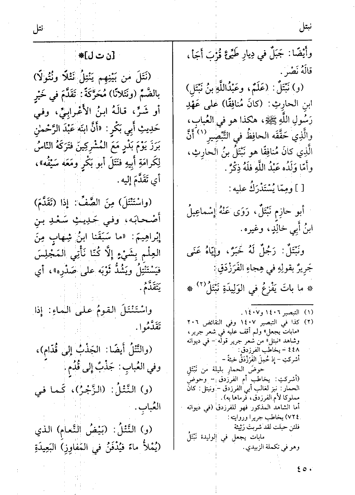 وَأَيْضًا: جبلٌ فِي ديارِ طَيِّئٍ قربَ أَجَأ، قَالَه نَصْر. نَبْتَلٌ: علَمٌ، وعَبْد الله بنُ نَبْتَلِ بنِ الْحَارِث: كَانَ مُنافقاً على عهدِ رسولِ الله صلّى الله عَلَيْهِ وَسلم، هَكَذَا هُوَ فِي العُباب، وَالَّذِي حقّقه الحافظُ فِي التبصير أنّ الَّذِي كَانَ منافقاً هُوَ نَبْتَلُ بنُ الْحَارِث، وأمّا ولَدُه عَبْد الله فَلهُ ذِكرٌ.