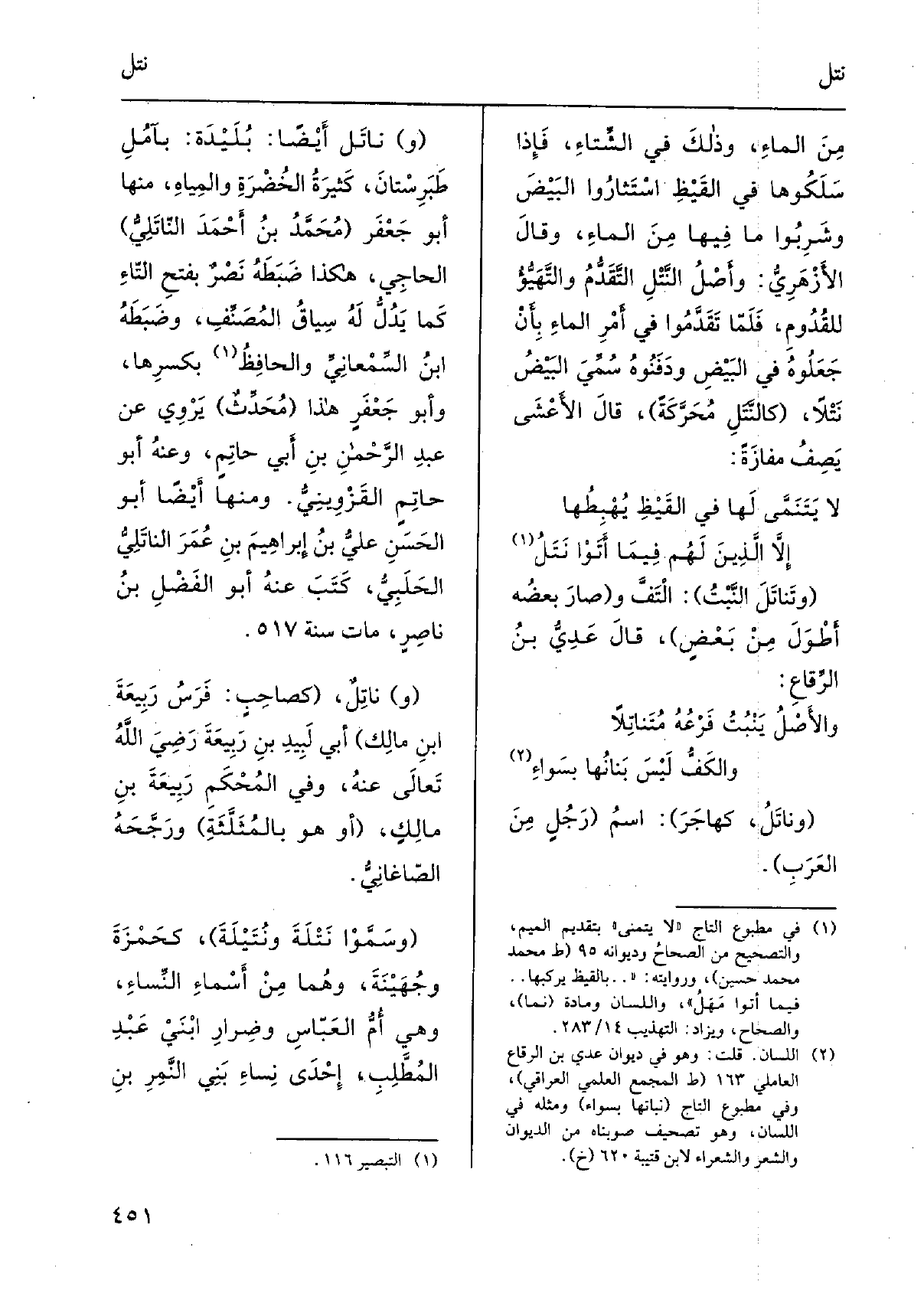 وناتَلُ، كهاجَرَ: اسمُ رجلٍ من الْعَرَب. ناتَل أَيْضا: بُلَيْدة: بآمُلِ طَبَرِسْتان، كثيرةُ الخُضرَةِ والمياه، مِنْهَا أَبُو جعفرٍ مُحَمَّد بن أحمدَ الناتَلِيُّ الحاجِي، هَكَذَا ضَبَطَه نَصرٌ بفتحِ التاءِ كَمَا يدلُّ لَهُ سِياقُ المُصَنِّف، وَضَبَطه ابنُ السَّمْعانيُّ والحافظُ بكسرِها، وَأَبُو جعفرٍ هَذَا مُحدِّثٌ يروي عَن عبدِ الرَّحْمَن بن أبي حاتمٍ، وَعنهُ أَبُو حاتمٍ القَزْوينيّ. وَمِنْهَا أَيْضا أَبُو الحسَنِ عليُّ بن إبراهيمَ بن عُمرَ الناتَليُّ الحلَبيّ، كَتَبَ عَنهُ أَبُو الفَضلِ بنُ ناصِرٍ، مَاتَ سنة. ناتِلٌ، كصاحِبٍ: فرَسُ رَبيعةَ بنِ مَالك أبي لَبيدِ بن رَبيعةَ رَضِيَ الله تَعالى عَنهُ، وَفِي المُحْكَم رَبيعةَ بن مالكٍ، أَو هُوَ بالمُثَلَّثةِ ورَجَّحَه الصَّاغانِيّ. وسَمَّوْا نَتْلَةَ ونُتَيْلةَ، كَحَمْزَةَ وجُهَيْنةَ، وهما من أسماءِ النِّسَاء، وَهِي أمُّ العبّاسِ وضِرارِ ابْنَيْ عبدِ المُطَّلِب، إِحْدَى نساءِ بَني النَّمِرِ بنِ