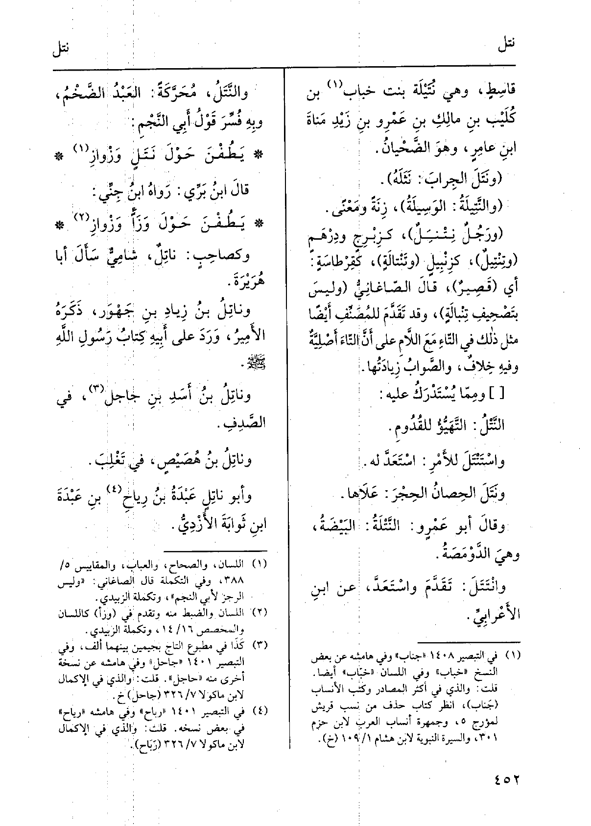 مَعَ اللامِ على أَن التاءَ أصليّةٌ وَفِيه خِلافٌ، والصوابُ زيادَتُها. ومِمّا يُسْتَدْرَك عَلَيْهِ: النَّتْل: التهيُّؤُ للقُدوم. واسْتَنْتَلَ للأمرِ: استعدَّ لَهُ. وَنَتَلَ الحصانُ الحِجْرَ: عَلاها. وَقَالَ أَبُو عمروٍ: النَّتْلَة: البَيْضة، وَهِي الدَّوْمَصة. وانْتَتَل: تقدّمَ واستعدَّ، عَن ابْن الأَعْرابِيّ. والنَّتْل، مُحَرَّكَةً: العبدُ الضخمُ، وَبِه فُسِّرَ قَوْلُ أبي النَّجم: يَطُفْنَ حَوْلَ نَتَلٍ وَزْوَازِ قَالَ ابنُ بَرِّي: رَوَاهُ ابنُ جِنِّي: يَطُفْنَ حَوْلَ وَزَأٍ وَزْوَازِ وكصاحبٍ: ناتِلٌ، شامِيٌّ سَأَلَ أَبَا هُرَيْرةَ. وناتِلُ بن زيادِ بن جَهْوَر، ذَكَرَه الأميرُ، وَرَدَ على أَبِيه كتابُ رسولِ اللهِ صلّى الله عَلَيْهِ وسلَّم. وناتِلُ بن أسَدِ بن جاجل، فِي الصَّدِفِ. وناتِلُ بن هُصَيْصٍ، فِي تَغْلِبَ. وَأَبُو ناتِلٍ عَبْدَةُ بنُ رياحِ بن عَبْدَةَ بنِ ثَوابَةَ الأَزْدِيُّ.