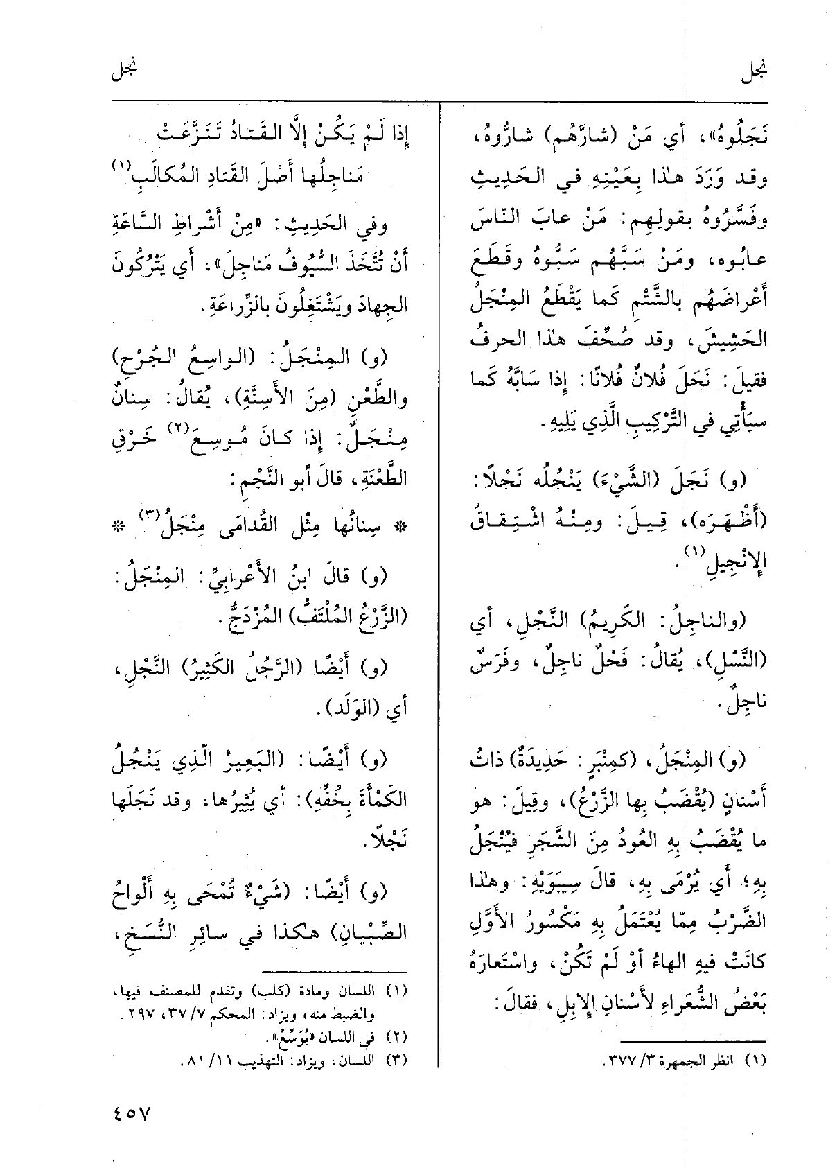 نجَلُوه، أَي مَن شارَّهُم شارُّوه، وَقد وَرَدَ هَذَا بعَينِه فِي الحديثِ وفسَّروه بقولِهم: مَن عابَ الناسَ عابُوه، وَمن سبَّهُم سَبُّوه وَقَطَعَ أَعْرَاضَهُم بالشَّتمِ كَمَا يَقْطَعُ المِنجَلُ الحَشيشَ، وَقد صُحِّفَ هَذَا الحرفُ فَقيل: نَحَلَ فلانٌ فلَانا: إِذا سابَّه كَمَا سَيَأْتِي فِي التركيبِ الَّذِي يَلِيهِ. نَجَلَ الشيءَ يَنْجُلُه نَجْلاً: أَظْهَره، قيل: وَمِنْه اشتِقاقُ الْإِنْجِيل. والناجِل: الكريمُ النَّجِل، أَي النَّسْل، يُقَال: فَحْلٌ ناجِلٌ، وَفَرَسٌ ناجِلٌ.