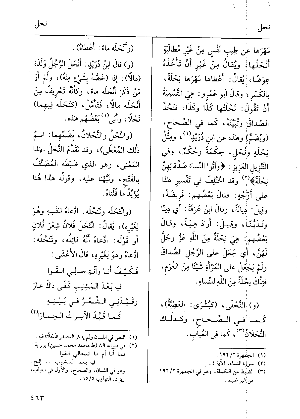 مَهْرَها عَن طِيبِ نَفسٍ من غَيْرِ مُطالَبةٍ أَنْحَلُها، وَيُقَال من غيرِ أَن تأخذَه عِوَضاً، يُقَال: أَعْطَاهَا مَهْرَها نِحْلَةً، بالكَسْر، وَقَالَ أَبُو عمروٍ: وَهِي التسميةُ أَن تَقول: نَحَلْتُها كَذَا وَكَذَا، فتحُدَّ الصّداقَ وتُبَيِّنَه، كَمَا فِي الصِّحاح، ويُضمُّ وَهَذِه عَن ابْن دُرَيْدٍ، ومِثلُ نِحْلَةٍ ونُحْلٍ، حِكةٌ وحُكْمٌ، وَفِي التنزيلِ الْعَزِيز: وَآتوا النساءَ صَدُقاتِهِنَّ نِحْلَةً وَقد اختُلفَ فِي تفسيرِ هَذَا على أَوْجُهٍ: فَقَالَ بعضُهم: فَريضَةً، وَقيل: دِيانَةً، وَقَالَ ابنُ عَرَفَةَ: أَي دِيناً وتَديُّناً، وَقيل: أرادَ هِبَةً، وَقَالَ بعضُهم: هِيَ نِحلَةٌ من اللهِ عزَّ وجلَّ لهُنَّ، أَي جَعَلَ على الرجلِ الصَّداقَ وَلم يَجْعَلْ على المرأةِ شَيْئا من الغُرْمِ، فتلكَ نِحلَةٌ من اللهِ للنِّسَاء. النُّحْلى، كبُشْرى: العَطيّة، كَمَا فِي الصِّحاح، وَكَذَلِكَ النُّحْلان، كَمَا فِي العُباب. وأَنْحَلَه مَاء: أعطَاهُ. قَالَ ابْن دُرَيْدٍ: أَنْحَلَ الرجلُ وَلَدَه مَالا: إِذا خصَّه بشيءٍ مِنْهُ، وَلم أرَ مَن ذَكَرَ أَنْحَله مَاء، وكأنّه تحريفٌ من أَنْحَله مَالا، فتأمَّلْ، كَنَحَله فيهمَا نَحْلاً، وأبى بعضُهم هَذِه. والنُّحْلُ والنُّحْلان، بضمِّهما: اسمُ ذَلِك المُعطى، وَقد تقدّمَ النُّحْلُ بِهَذَا الْمَعْنى، وَهُوَ الَّذِي ضَبَطَه المُصَنِّف بالفَتْح، ونبَّهْنا عَلَيْهِ، وقولُه هَذَا هُنَا يؤَيِّدُ مَا قُلناه. وانْتَحلَه وَتَنَحَّلَه: ادَّعاهُ لنَفسِه وَهُوَ لغَيرِه، يُقَال: انْتَحلَ فلانٌ شِعرَ فلانٍ أَو قَوْلَه: ادَّعاه أنّه قائلُه، وَتَنَحَّلَه: ادَّعاه وَهُوَ لغَيرِه، قَالَ الْأَعْشَى: