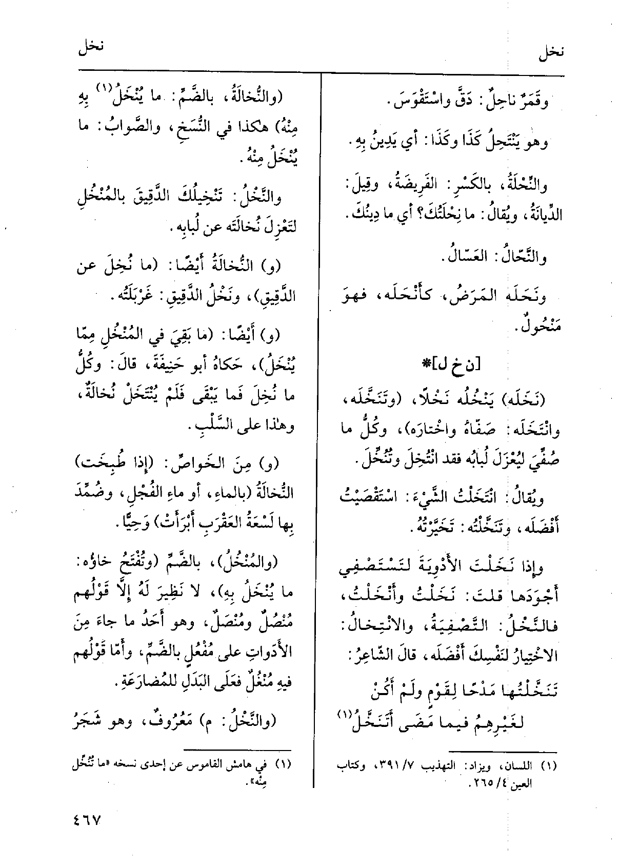 والنُّخالَة، بالضَّمّ: مَا يُنخَلُ بِهِ مِنْهُ هَكَذَا فِي النّسخ، وَالصَّوَاب: مَا يُنخَلُ مِنْهُ. والنَّخْلُ: تَنْخِيلُكَ الدقيقَ بالمُنْخُلِ لتَعزِلَ نُخالَتَه عَن لُبابِه. النُّخالَةُ أَيْضا: مَا نُخِلَ عَن الدَّقِيق، وَنَخْلُ الدَّقِيق: غَرْبَلَتُه. أَيْضا: مَا بَقِي فِي المُنْخُلِ ممّا يُنخَل، حَكَاهُ أَبُو حنيفَة، قَالَ: وكُلُّ مَا نُخِلَ فَمَا يبْقى فَلم يُنْتَخَلْ نُخالَةٌ، وَهَذَا على السَّلْب. من الخَواصِّ: إِذا طُبِخَتْ النُّخالَةُ بِالْمَاءِ، أَو ماءِ الفُجلِ، وضُمِّدَ بهَا لَسْعَةُ العَقربِ أَبْرَأَتْ وَحِيّاً. والمُنْخُل، بالضَّمّ وتُفتَحُ خاؤُه: مَا يُنخَلُ بِهِ، لَا نَظيرَ لَهُ إلاّ قَوْلُهم مُنْصُلٌ ومُنْصَلٌ، وَهُوَ أحدُ مَا جاءَ من الأدواتِ على مُفْعُلٍ بالضَّمّ، وأمّا قولُهم فِيهِ مُنْعُلٌ فعلى البدَلِ للمضارعةِ. والنَّخْل: م مَعْرُوفٌ، وَهُوَ شجَرُ