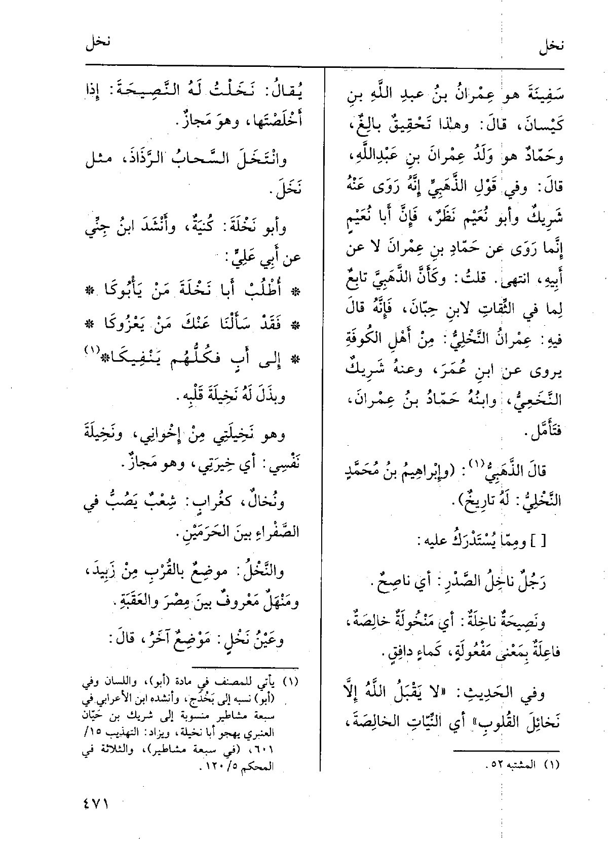 سَفينةَ هُوَ عِمْرانُ بن عَبْد الله بن كَيْسَانَ، قَالَ: وَهَذَا تحقيقٌ بالِغٌ، وحَمّادٌ هُوَ ولَدُ عِمْرانَ بن عَبْد الله، قَالَ: وَفِي قَوْلِ الذهَبيِّ إنّه روى عَنهُ شَريكٌ وَأَبُو نُعَيْم نظَرٌ، فإنّ أَبَا نُعَيْمٍ إنّما روى عَن حَمّادِ بن عِمْرانَ لَا عَن أَبِيه، انْتهى. قلتُ: وكأنّ الذهَبيَّ تابعٌ لِما فِي الثِّقاتِ لابنِ حِبّانَ، فإنّه قالَ فِيهِ: عِمْرانُ النَّخْلِيُّ: من أهلِ الكُوفةِ يرْوى عَن ابنِ عُمرَ، وَعنهُ شَريكٌ النَّخَعيُّ، وابنُه حَمّادُ بن عِمْرانَ، فتأمَّلْ. قَالَ الذهَبيُّ: وإبراهيمُ بن محمدٍ النَّخْلِيُّ: لَهُ تاريخٌ. ومِمّا يُسْتَدْرَك عَلَيْهِ: رجلٌ ناخِلُ الصدرِ: أَي ناصِحٌ.