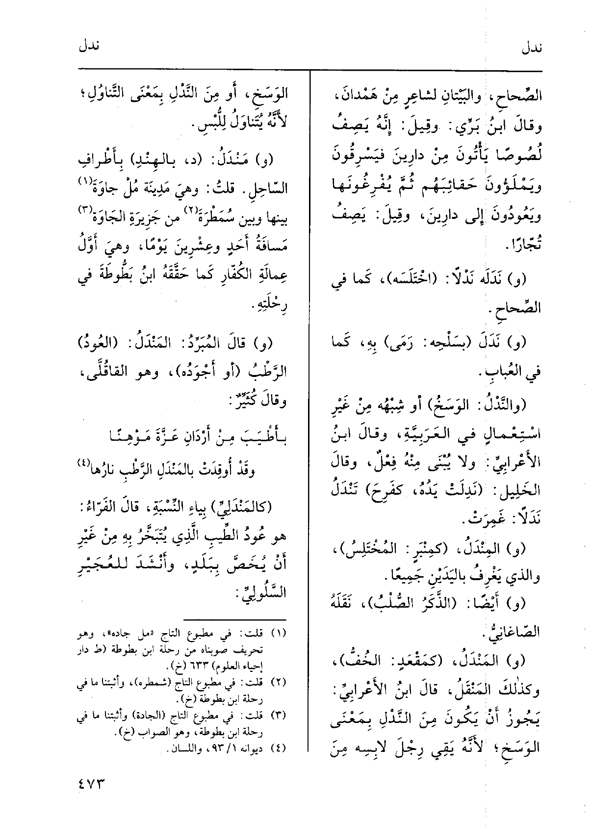 الصِّحاح، والبَيْتانِ لشاعرٍ من هَمْدَان، وَقَالَ ابنُ بَرِّي: وَقيل: إنّه يصفُ لصوصاً يأتونَ من دارِينَ فيسرِقونَ ويملؤونَ حقائِبَهم ثمّ يُفْرِغونَها ويعودونَ إِلَى دارِين، وَقيل: يصفُ تُجّاراً. نَدَلَه نَدْلاً: اخْتَلسَه، كَمَا فِي الصِّحاح. نَدَلَ بسَلْحِه: رمى بِهِ، كَمَا فِي العُباب. والنَّدْل: الوسَخُ أَو شِبهُه من غيرِ استعمالٍ فِي العربيّة، وَقَالَ ابْن الأَعْرابِيّ: وَلَا يُبنى مِنْهُ فِعْلٌ، وَقَالَ الخَليل: نَدِلَتْ يدُه، كفَرِحَ تَنْدَلُ نَدَلاً: غَمِرَتْ. المِنْدَل، كمِنبَرٍ: المُختَلِس، وَالَّذِي يَغْرِفُ باليدَيْنِ جَمِيعًا. أَيْضا: الذكَرُ الصُّلبُ، نَقله الصَّاغانِيّ. المَنْدَل، كَمَقْعَدٍ: الخُفّ، وَكَذَلِكَ المَنْقَل، قَالَ ابْن الأَعْرابِيّ: يجوزُ أَن يكون من النَّدْلِ بِمَعْنى الوسَخِ لأنّه يَقي رِجْلَ لابِسِه من الوسَخ، أَو من النَّدْلِ بِمَعْنى التَّناوُلِ لأنّه يُتَناوَلُ للُّبْسِ. مَنْدَلُ: د، بالهِندِ بأطرافِ الساحلِ. قلتُ: وَهِي مَدِينَة مُلْ جاوَةَ بَينهَا وَبَين سُمَطْرَةَ من جزيرةِ الجاوَة مسافةُ أحَدٍ وعِشرينَ يَوْمَاً، وَهِي أوّلُ عِمالَةِ الكُفّارِ كَمَا حقّقَه ابنُ بَطُّوطَةَ فِي رِحْلَتَيْه. قَالَ المُبَرِّد: المَنْدَل: العُودُ الرَّطْبُ أَو أَجْوَدُه، وَهُوَ القاقُلَّى، وَقَالَ كُثَيِّرٌ: