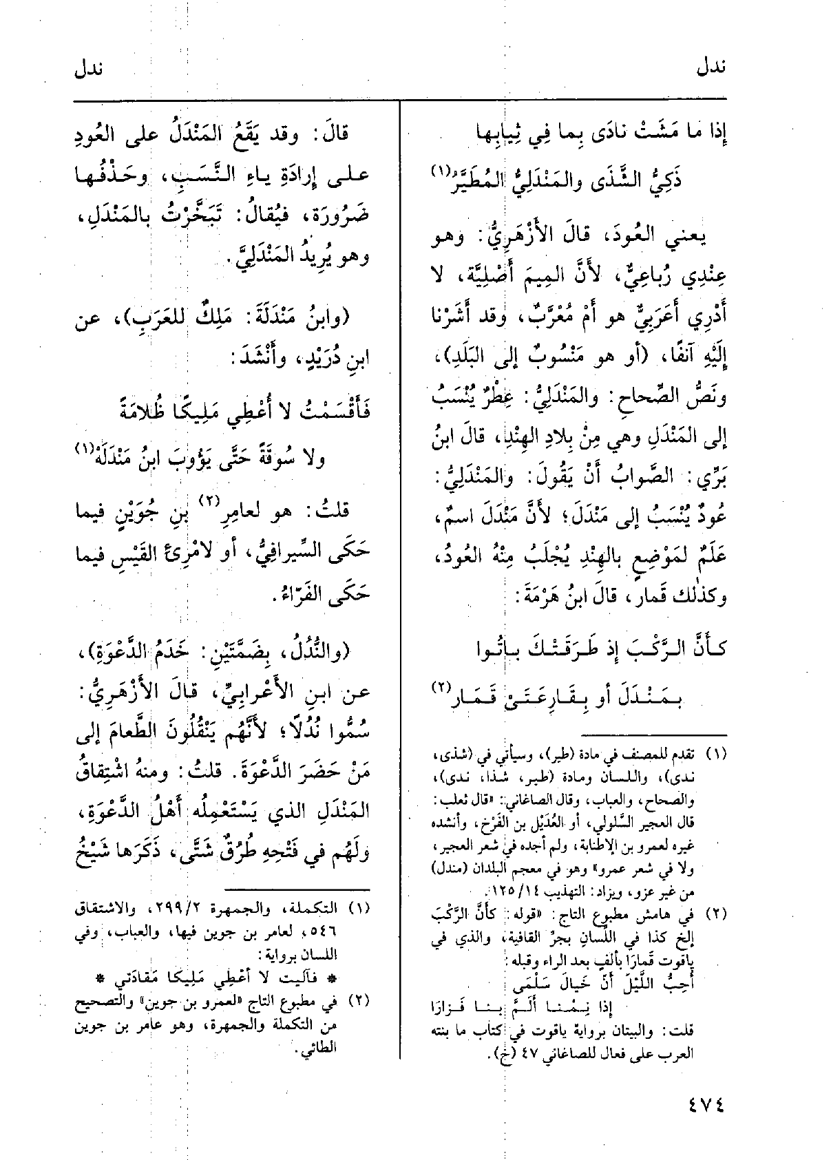 قلتُ: هُوَ لعامرِ بن جُوَيْنٍ فِيمَا حكى السِّيرافيُّ، أَو لامرئِ القَيسِ فِيمَا حكى الفَرّاء. والنُّدُل، بضمّتَيْن: خدَمُ الدَّعوةِ، عَن ابْن الأَعْرابِيّ، قَالَ الأَزْهَرِيّ: سُمُّوا نُدُلاً لأنّهم يَنْقُلونَ الطعامَ إِلَى مَن حَضَرَ الدعوةَ. قلتُ: وَمِنْه اشتقاقُ المَنْدَلِ الَّذِي يَسْتَعمِلُه أَهْلُ الدعوةِ، وَلَهُم فِي فَتْحِه طُرُقٍ شَتّى، ذَكَرَها شَيْخُ