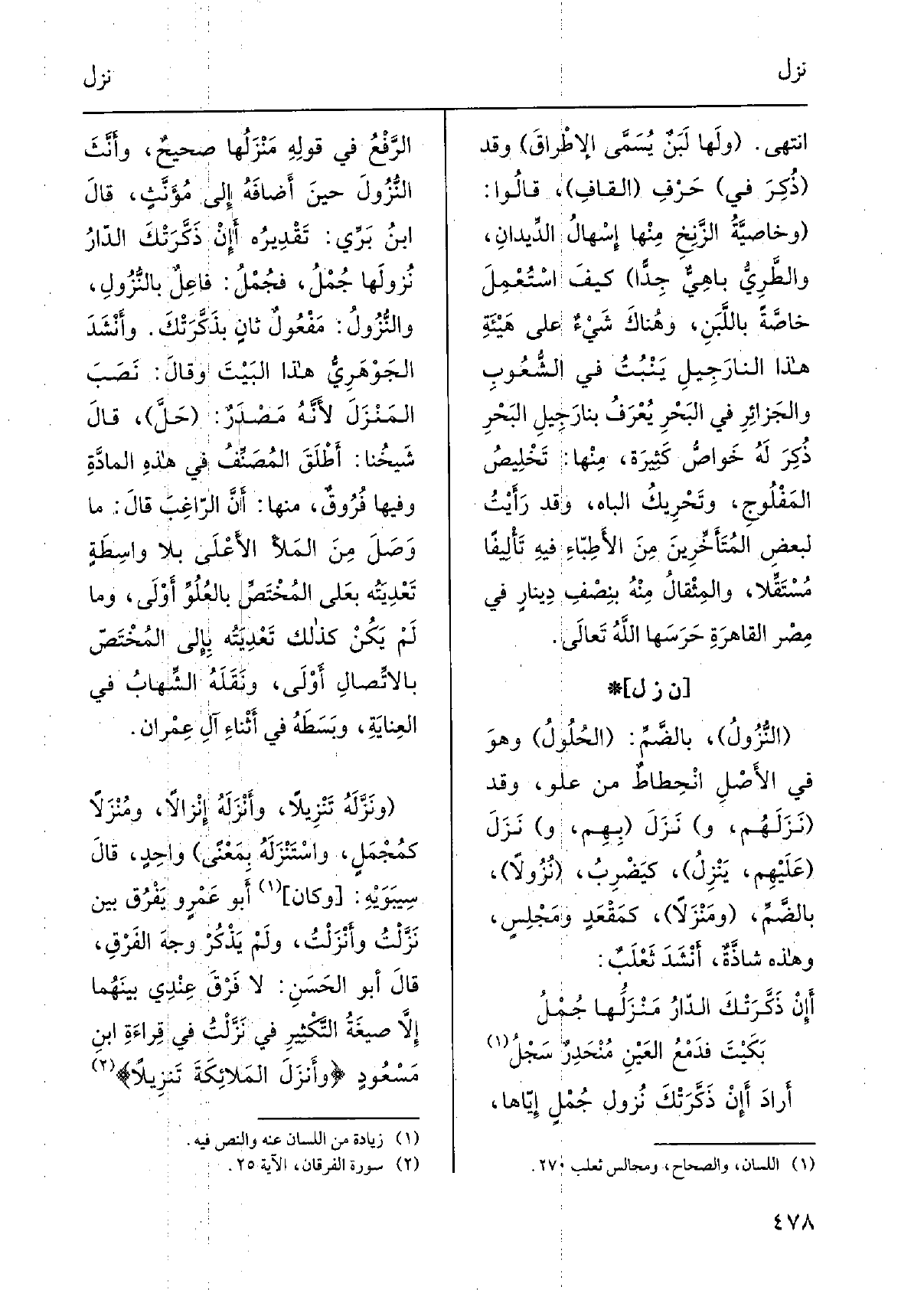 أرادَ أَإن ذكَّرَتْكَ نزُول جُمْلٍ إيّاها، الرفعُ فِي قولِه مَنْزَلُها صحيحٌ، وأنّثَ النزولَ حِين أضافَه إِلَى مُؤنَّثٍ، قَالَ ابنُ بَرِّي: تقديرُه أَإِنْ ذكَّرَتْكَ الدارُ نُزولَها جُمْلُ، فجُمْل: فاعِلٌ بالنُّزول، والنُّزول: مَفْعُولٌ ثانٍ بذَكَّرَتْكَ. وأنشدَ الجَوْهَرِيّ هَذَا البيتَ وَقَالَ: نَصَبَ المَنزَلَ لأنّه مصدرٌ: حَلَّ، قَالَ شيخُنا: أَطْلَق المُصَنِّف فِي هَذِه المادّةِ وفيهَا فُروقٌ، مِنْهَا: أنّ الراغبَ قَالَ: مَا وَصَلَ من الملأِ الْأَعْلَى بِلَا واسطةٍ تَعْدِيَتُه بعلى المُختَصِّ بالعُلوِّ أَوْلَى، وَمَا لم يكن كَذَلِك تَعْدِيَتُه بإلى المُختَصّ بالاتِّصالِ أَوْلَى، وَنَقَله الشِّهابُ فِي العِنايةِ، وَبَسَطه فِي أثناءِ آلِ عِمْران. ونزَّلَه تَنْزِيلاً، وأَنْزَلَه إنْزالاً، ومُنْزَلاً كمُجْمَلٍ، واسْتَنزلَه بِمَعْنى واحدٍ، قَالَ سِيبَوَيْهٍ: وَكَانَ أَبُو عمروٍ يَفْرُق بَين نزَّلْتُ وأَنْزَلْتُ، وَلم يَذْكُرْ وجهَ الفرقِ، قَالَ أَبُو الحسَن: لَا فَرْقَ عِنْدِي بَينهمَا إلاّ صيغةُ التكثيرِ فِي نزَّلْتُ فِي قراءةِ ابنِ مَسْعُودٍ: وَأَنْزَلَ الملائكةَ تَنْزِيلاً