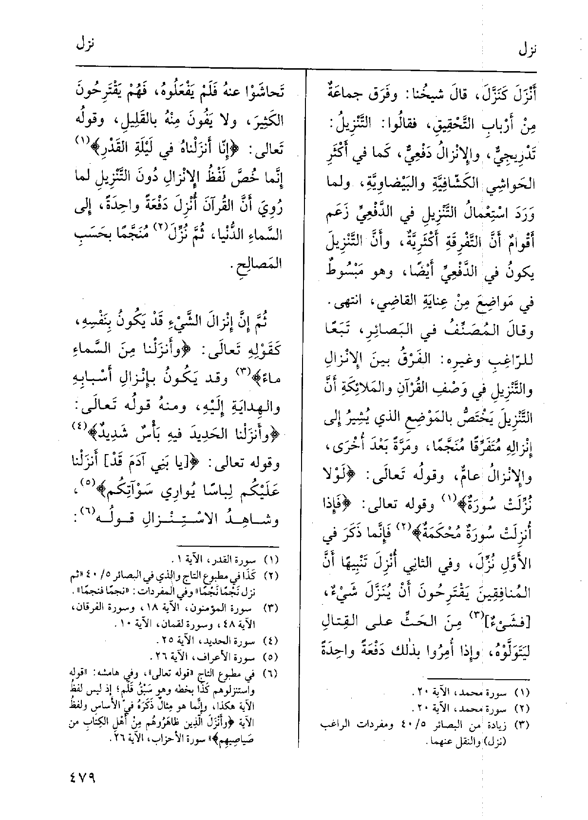 أَنْزَل كنَزَّلَ، قَالَ شيخُنا: وَفَرَق جماعةٌ من أربابِ التَّحْقِيق، فَقَالُوا: التَّنْزيل: تَدْرِيجيٌّ، والإنْزالُ دَفْعِيٌّ، كَمَا فِي أكثرِ الحَواشي الكَشّافِيّةِ والبَيْضاوِيّة، وَلما وَرَدَ استعمالُ التَّنْزيلِ فِي الدَّفعيِّ زَعَمَ أقوامٌ أنّ التفْرِقةَ أكثريّةٌ، وأنّ التَّنْزيلَ يكونُ فِي الدَّفْعيِّ أَيْضا، وَهُوَ مبسوطٌ فِي مواضعَ من عنايَةِ القَاضِي، انْتهى. وَقَالَ المُصَنِّف فِي البصائر: تَبَعَاً للراغب وغيرِه: الفرقُ بَين الإنْزالِ والتَّنْزيلِ فِي وَصْفِ القرآنِ والملائكةِ أنّ التَّنْزيلَ يَخْتَصُّ بالمَوضعِ الَّذِي يُشيرُ إِلَى إنْزالِه مُتَفرِّقاً مُنَجَّماً، ومرّةً بعد أُخرى، والإنْزالُ عامٌّ، وقَوْله تَعالى: لَوْلَا نُزِّلَتْ سورةٌ وقَوْله تَعالى: فَإِذا أُنْزِلَتْ سورةٌ مُحكَمَةٌ فإنّما ذَكَرَ فِي الأوّلِ نُزِّلَ، وَفِي الثَّانِي أُنْزِلَ تَنْبِيهاً أنّ المُنافِقينَ يقترحونَ أَن يُنَزَّلَ شيءٌ، فشيءٌ من الحَثِّ على القتالِ ليَتَوَلَّوْه، وَإِذا أُمِروا بذلك دَفْعَةً وَاحِدَة تَحاشَوْا عَنهُ فَلم يفعلوه، فهم يقترِحونَ الْكثير، وَلَا يَفُونَ مِنْهُ بِالْقَلِيلِ، وقَوْله تَعالى: إنّا أَنْزَلْناه فِي ليلةِ القَدْرِ إنّما خُصَّ لَفْظُ الإنْزالِ دونَ التَّنْزيلِ لما رُوِيَ أنّ القرآنَ أُنْزِلَ دَفْعَةً وَاحِدَة، إِلَى السماءِ الدُّنْيَا، ثمّ نُزِّلَ مُنَجَّماً بحسَبِ المَصالِح. ثمّ إنّ إنْزالَ الشيءِ قد يكونُ بنَفسِه، كقَوْله تَعالى: وَأَنْزلْنا من السماءِ مَاء وَقد يكونُ بإنْزالِ أسبابِه والهِدايةِ إِلَيْهِ، وَمِنْه قَوْله تَعالى: وَأَنْزَلْنا الحديدَ فِيهِ بأسٌ)