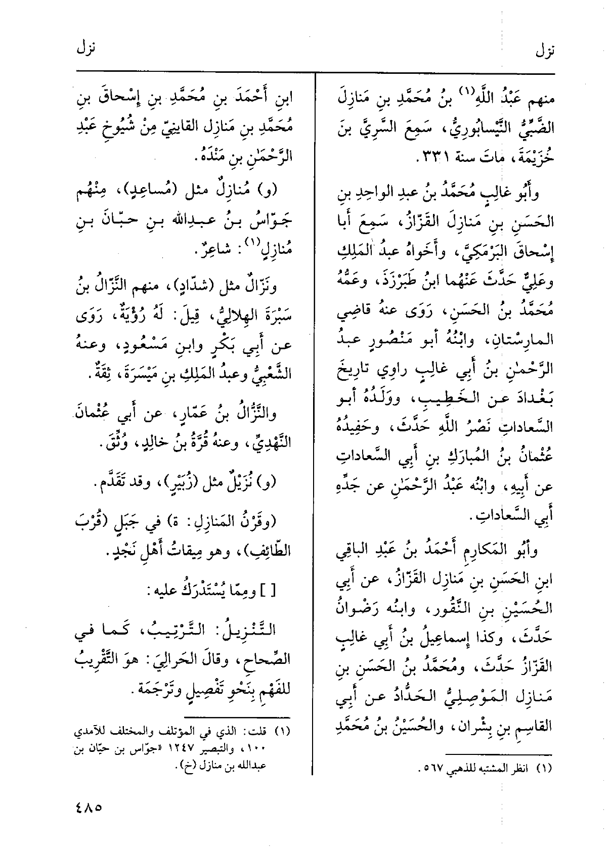 مِنْهُم عَبْد الله بن مُحَمَّد بن مَنازِلَ الضَّبِّيُّ النَّيْسابوريُّ، سَمِعَ السَّرِيَّ بن خُزَيْمةَ، مَاتَ سنة) . وَأَبُو غالبٍ مُحَمَّد بن عبدِ الواحدِ بن الحسَنِ بن مَنازِلَ القَزّاز، سَمِعَ أَبَا إسحاقَ البَرْمَكِيَّ، وَأَخَواه عبدُ الملِكِ وعليٌّ حدَّثَ عَنْهُمَا ابنُ طَبَرْزَذَ، وعمُّه مُحَمَّد بن الحسنِ، روى عَنهُ قَاضِي المارِسْتان، وابنُه أَبُو منصورٍ عبدُ الرحمنِ بنُ أبي غالبٍ رَاوِي تاريخَ بغدادَ عَن الْخَطِيب، وَوَلَدُه أَبُو السَّعاداتِ نَصْرُ اللهِ حدَّثَ، وحَفيدُه عثمانُ بن المُبارَكِ بن أبي السَّعاداتِ عَن أَبِيه، وابنُه عَبْدُ الرحمنِ عَن جدِّه أبي السَّعادات. وَأَبُو المَكارِمِ أَحْمد بن عَبْدِ الْبَاقِي بنِ الحسَنِ بن مَنازِلَ القَزّاز، عَن أبي الحُسينِ بنِ النَّقُور، وابنُه رَضْوَانُ حدَّثَ، وَكَذَا إسماعيلُ بنُ أبي غالبٍ القَزّازُ حدَّث، وَمُحَمّد بنُ الحسنِ بن مَنازِل المَوْصِلِيُّ الحَدّادُ عَن أبي القاسمِ بن بِشْران، والحسينُ بن مُحَمَّد بن أحمدَ بن مُحَمَّد بن إسحاقَ بن مُحَمَّد بن مَنازِلَ القاينيّ من شيوخِ عبدِ الرحمنِ بنِ مَنْدَه. مُنازِلٌ مثل مُساعِدٍ، مِنْهُم جَوّاسُ بن عَبْد الله بنِ حِبّانَ بن مُنازِلٍ: شاعرٌ.