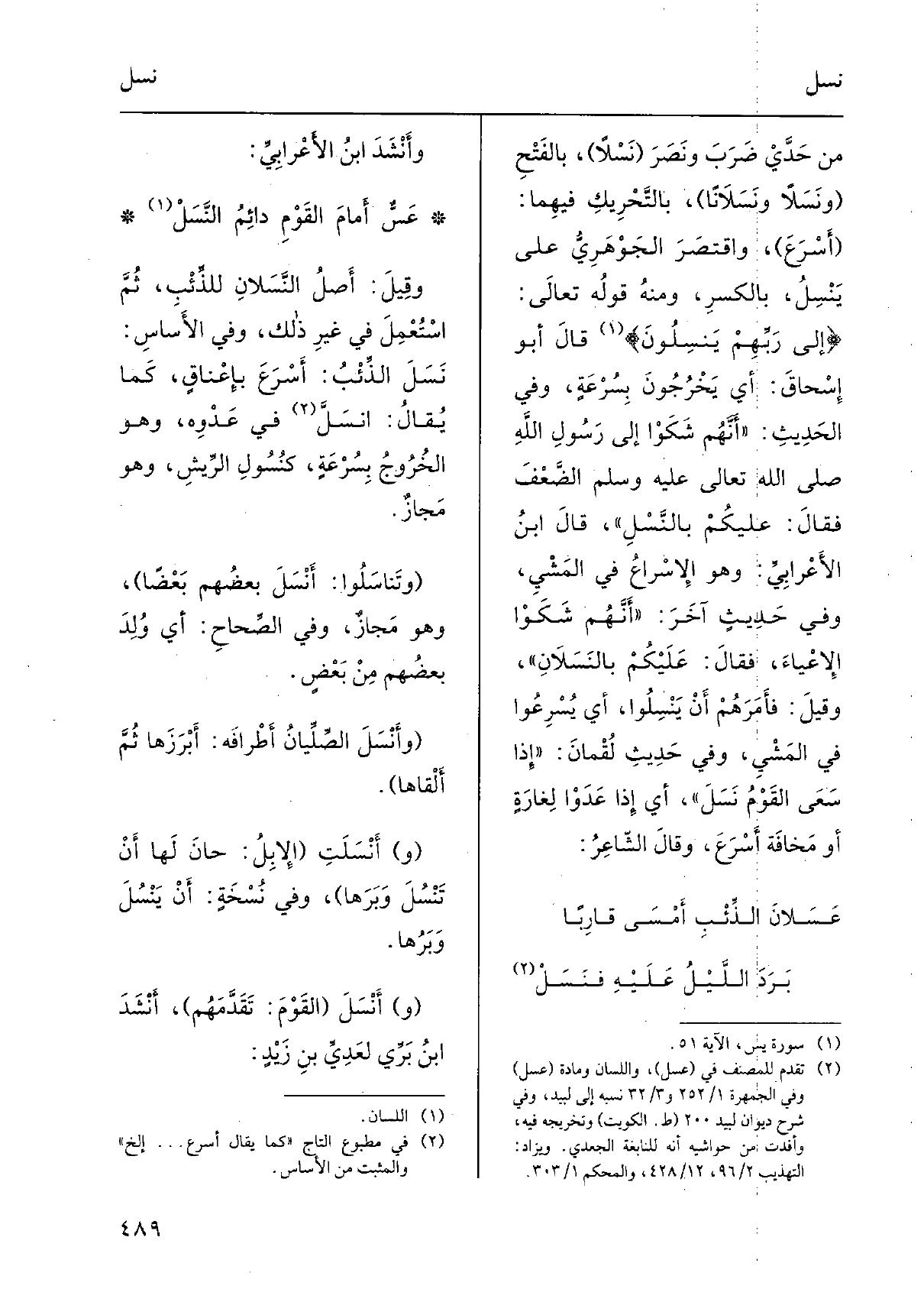 من حدَّيْ ضرَبَ ونصَرَ، نَسْلاً، بِالْفَتْح، ونسَلاً ونَسَلاناً، بالتَّحريكِ فيهِما: أَسرعَ، واقتصَرَ الجَوْهَرِيّ على ينسِلُ، بالكسْرِ، وَمِنْه قولُه تَعَالَى: إِلَى رَبِّهِمْ يَنْسِلُونَ، قَالَ أَبو لإسحاقَ: أَي يَخرُجونَ بسُرعَةٍ، وَفِي الحديثِ: أَنَّهُم شَكَوا إِلَى رسولِ اللهِ صلّى الله تَعَالَى عَلَيْهِ وسلَّم الضَّعْفَ فَقَالَ: عليكُمْ بالنَّسْلِ، قَالَ ابْن الأَعْرابِيِّ: وَهُوَ الإسراعُ فِي المَشيِ، وَفِي حديثٍ آخَرَ: أَنَّهُم شَكَوا الإعياءَ، فَقَالَ: عليكُمْ بالنَّسَلانِ، وَقيل: فأَمرَهُمْ أَن يَنْسِلوا، أَي يُسرعوا فِي المَشيِ، وَفِي حديثِ لقمانَ: إِذا سَعى القَوْمُ نَسَلَ، أَي إِذا عَدَوا لِغارَةٍ أَو مَخافة أَسْرَعَ، وَقَالَ الشّاعِرُ: