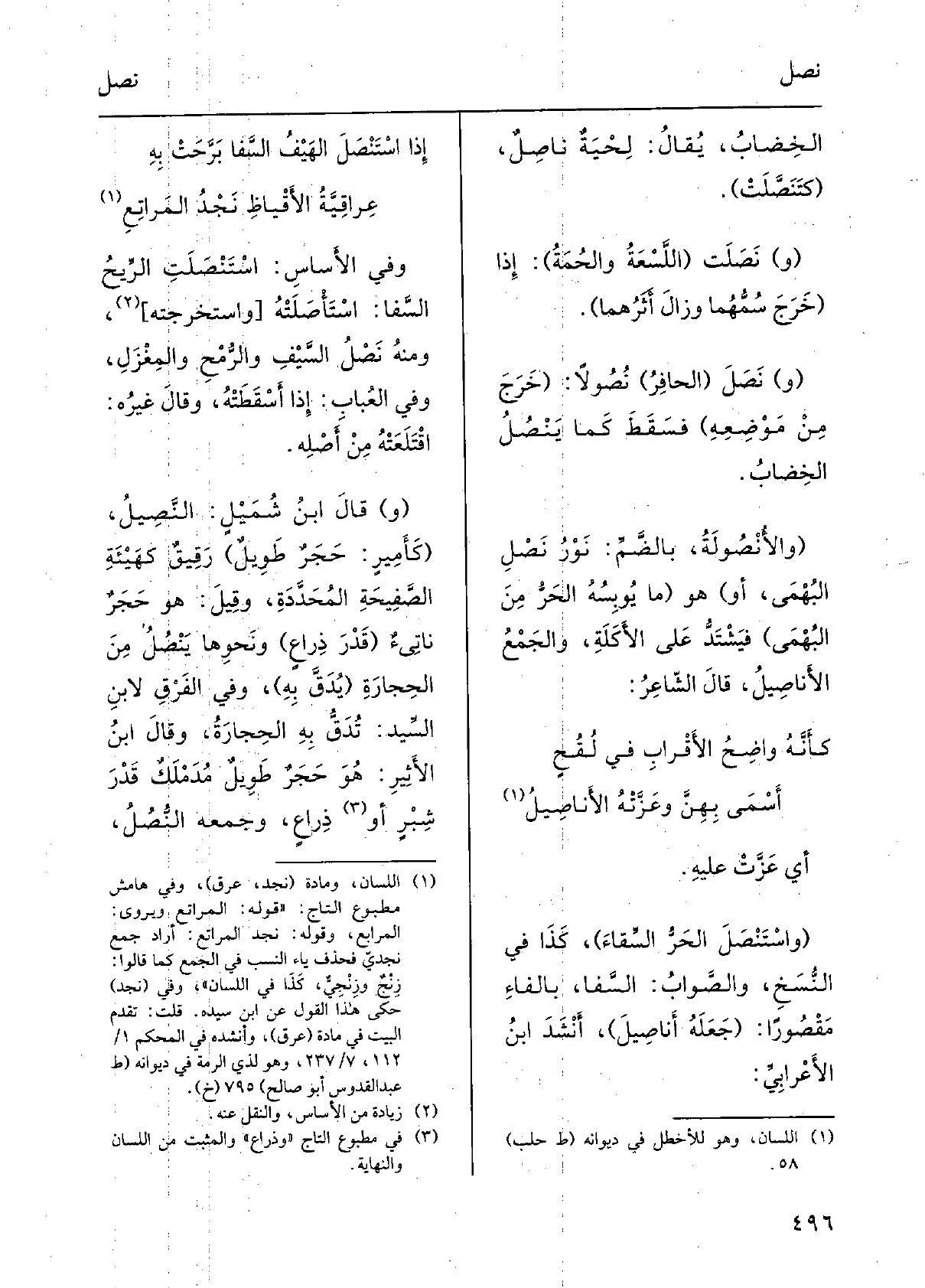 وَفِي الأَساس: اسْتَنْصَلَتِ الرِّيحُ السَّفا: اسْتأْصَلَتْهُ، واستخرَجَتْهُ، وَمِنْه نصلُ السّيفِ والرُّمْحِ والمِغْزَلِ، وَفِي العبابِ: إِذا أَسْقَطَتْهُ، وَقَالَ غيرُه: اقْتَلَعَتْهُ من أَصْلِهِ. قَالَ ابنُ شُمَيْلٍ: النَّصِيلُ، كأَميرٍ: حجَرٌ طَويلٌ، رقيقٌ كهيئةِ الصَّفيحَةِ المُحَدَّدَةِ، وَقيل: هُوَ حجَرٌ ناتِئٌ قدْرَ ذِراعٍ ونحوِها يَنْصُلُ من الحِجارَةِ يُدَقُّ بهِ، وَفِي الفَرْقِ لابنِ السِّيد: تُدَقُّ بِهِ الحِجارَةُ، وَقَالَ ابنُ الأَثيرِ: هُوَ حجَرٌ طويلٌ مُدَمْلَكٌ قدْرَ شِبْرٍ أَو ذِراعٍ، وجمعُهُ النُّصُلُ،