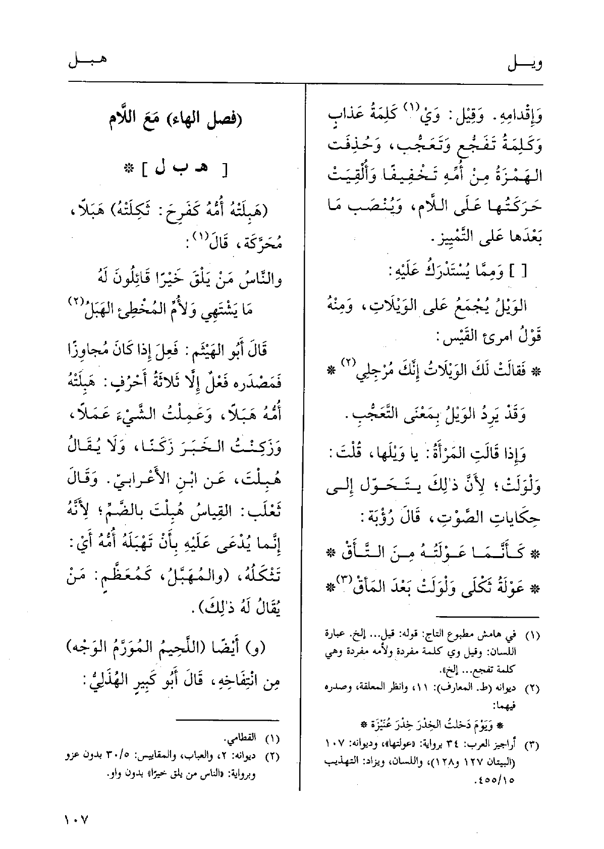 قَالَ أَبُو الهَيْثَم: فَعِل إِذا كَانَ مُجاوِزًا فَمَصْدَره فَعْلٌ إِلَّا ثَلاثَةُ أَحْرُفٍ: هَبِلَتْهُ أُمُّهُ هَبَلاً، وَعَمِلْتُ الشَّيْءَ عَمَلاً، وَزَكِنْتُ الخَبَرَ زَكَنًا، وَلَا يُقَالُ هُبِلْتَ، عَن ابْنِ الأَعْرابّي. وَقَالَ ثَعْلَب: القِياسُ هُبِلْتَ بالضَّمِّ؛ لِأَنَّهُ إِنَّما يُدْعَى عَلَيْهِ بِأَنْ تَهْبَلَهُ أُمُّهُ أَيْ: تَثْكلُهُ، (والمُهَبَّلُ، كَمُعَظَّمٍ: مَنْ يُقَالُ لَهُ ذلِكَ) . (و) أَيْضًا (اللَّحِيمُ المُوَرَّمُ الوَجْه) مِن انْتِفَاخِهِ، قَالَ أَبُو كَبِيرٍ الهُذَلِيُّ: