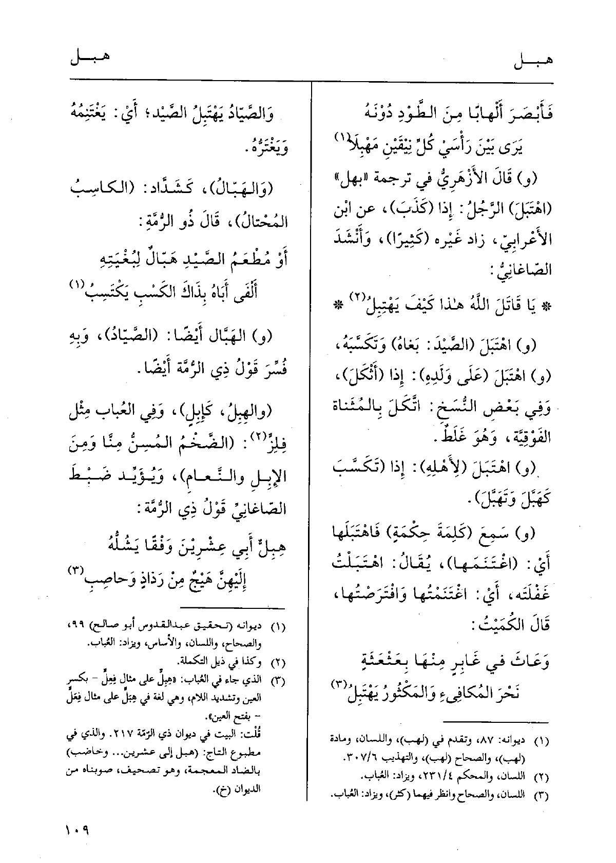 (و) الهَبَّال أَيْضًا: (الصَّيّادُ) ، وَبِهِ فُسِّرَ قَوْلُ ذِي الرُّمَّة أَيْضًا. والهِبِلُ، كَإِبِلٍ) ، وَفِي العُباب مِثْل فِلِزٍّ: (الضَّخْمُ المُسِنُّ مِنَّا وَمِنَ الإِبِلِ والنَّعامِ) ، وَيُؤَيِّد ضَبْطَ الصّاغانِيِّ قَوْلُ ذِي الرُّمَّة: