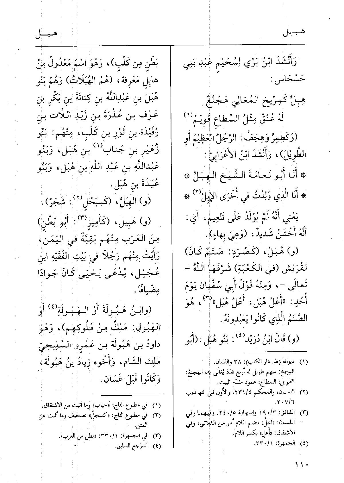 يَعْنِي أَنَّهُ لَمْ يُوْلَدْ عَلَى تَنْعِيم، أَيْ: أَنَّهُ أَخْشَنُ شَديدٌ، (وَهِيَ بِهاءٍ) . (و) هُبَلُ، (كَصُرَدٍ: صَنَمٌ كَانَ) لقُرَيْش (فِي الكَعْبَةِ) شَرَّفَهَا اللَّهُ - تَعالَى -، وَمِنْهُ قَوْلُ أَبِي سُفْيان يَوْمَ أُحُدٍ: " أَعْلُ هُبَل، أَعْلُ هُبَل "، هُوَ الصَّنَمُ الَّذِي كَانُوا يَعْبُدونَهُ. (و) قَالَ ابْنُ دُرَيْد: بَنُو هُبَل: (أَبُو بَطْنٍ مِن كَلْبٍ) ، وَهُوَ اسْمٌ مَعْدُولٌ مِنْ هابِلٍ مَعْرِفة، (هُمُ الهُبَلَاتُ) وَهُمْ بَنُو هُبَلَ بنِ عَبْدِ اللَّهُ بنِ كِنانَةَ بنِ بَكْرِ بنِ عَوْف بن عُذْرَةَ بنِ زَيْدِ اللاَّت بنِ رُفَيْدَة بنِ ثَوْرِ بنِ كَلْبٍ، مِنْهُم: بَنُو زُهَيْرِ بنِ جَناب بنِ هُبَل، وَبَنُو عَبْد اللَّه بنِ عَبْد اللَّهِ بنِ هُبَل، وَبَنُو عُبَيْدَةَ بنِ هُبَل. (و) الهِبَلُّ، (كَسِبَحْلٍ: شَجَرٌ) . (و) هَبِيل، (كَأَمِيٍ رٍ: أَبُو بَطْنٍ) مِنَ العَرَب مِنْهُم بَقِيَّةٌ فِي اليَمَن، رَأَيْتُ مِنْهُم رَجُلاً فِي بَيْتِ الفَقَيْهِ ابنِ عُجَيْل، يُدْعَى يَحْيَى كَانَ جَوادًا مِضْيافًا.