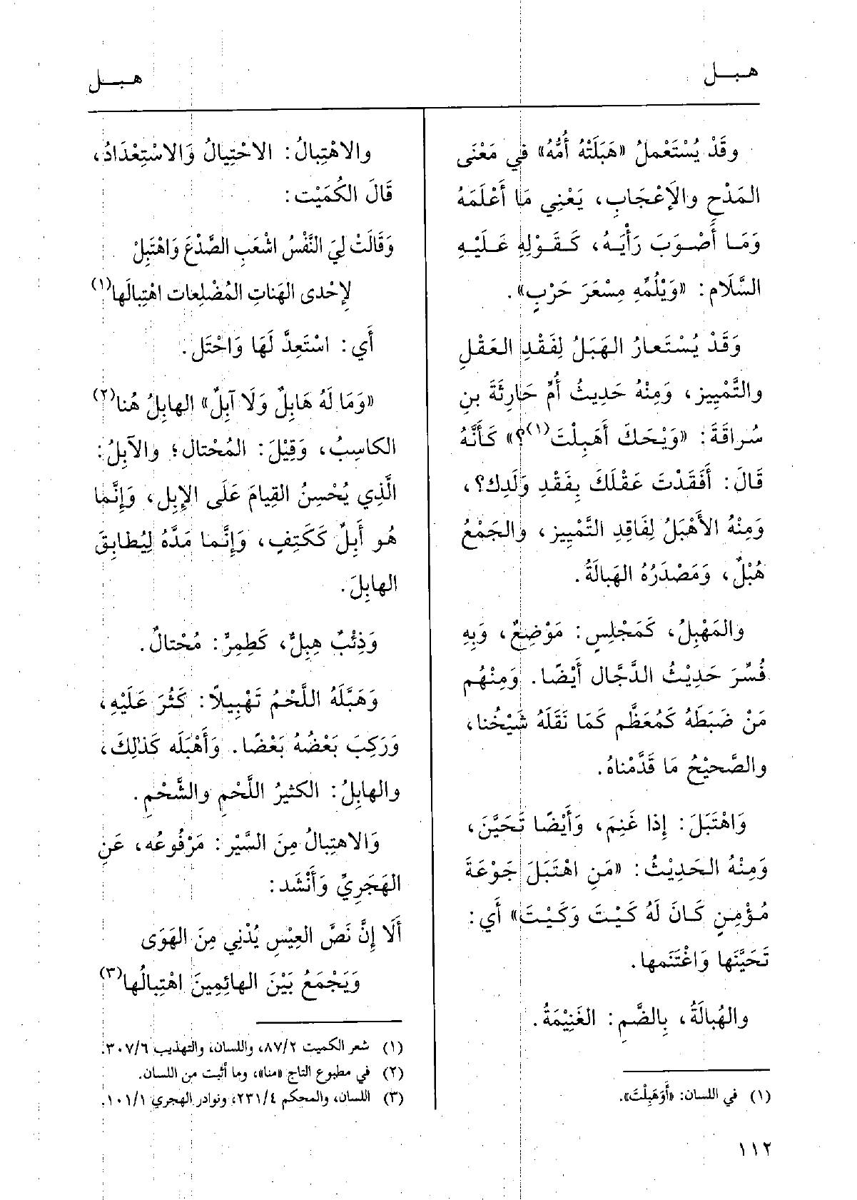 وقَدْ يُسْتَعْملُ (هَبَلَتْهُ أُمُّهُ) فِي مَعْنَى المَدْحِ والَإعْجَابِ، يَعْنِي مَا أَعْلَمَهُ وَمَا أَصْوَبَ رَأْيَهُ، كَقَوْلِهِ عَلَيْهِ السَّلَام: " وَيْلُمِّهِ مِسْعَرَ حَرْبٍ ". وَقَدْ يُسْتَعارُ الهَبَلُ لِفَقْدِ العَقْلِ والتَّمْيِيز، وَمِنْهُ حَدِيثُ أُمِّ حَارِثَةَ بنِ سُراقَةَ: " وَيْحَكَ أَهَبِلْتَ؟ " كَأَنَّهُ قَالَ: أَفَقْدتَ عَقْلَكَ بِفَقْدِ وَلَدِك؟ ، وَمِنْهُ الَأهْبَلُ لِفَاقِدِ التَّمْيِيز، والجَمْعُ هُبْلٌ، وَمَصْدَرُهُ الهَبالَةُ. والمَهْبِلُ كَمَجْلِسٍ: مَوْضِعٌ، وَبِهِ فُسِّرَ حَدِيْثُ الدَّجَّال أَيْضًا. وَمِنْهُم مَنْ ضَبَطَهُ كَمُعَظَّم كَمَا نَقَلَهُ شَيْخُنا، والصَّحيْحُ مَا قَدَّمْناهُ. وَاهْتَبَلَ: إِذا غَنِمَ، وَأَيْضًا تَحَيَّنَ وَمِنْهُ الحَدِيْثُ: " مَنِ اهْتَبَلَ جَوْعَةَ مُؤْمِنٍ كَانَ لَهُ كَيْتَ وَكَيْتَ " أَي: تَحَيَّنهَا وَاغْتَنَمها. والهُبالَةُ، بِالضَّمِ: الغَنِيْمَةُ والاهْتِبالُ: الاحْتِيالُ والاسْتِعْدادُ،. قَالَ الكُمَيْت: