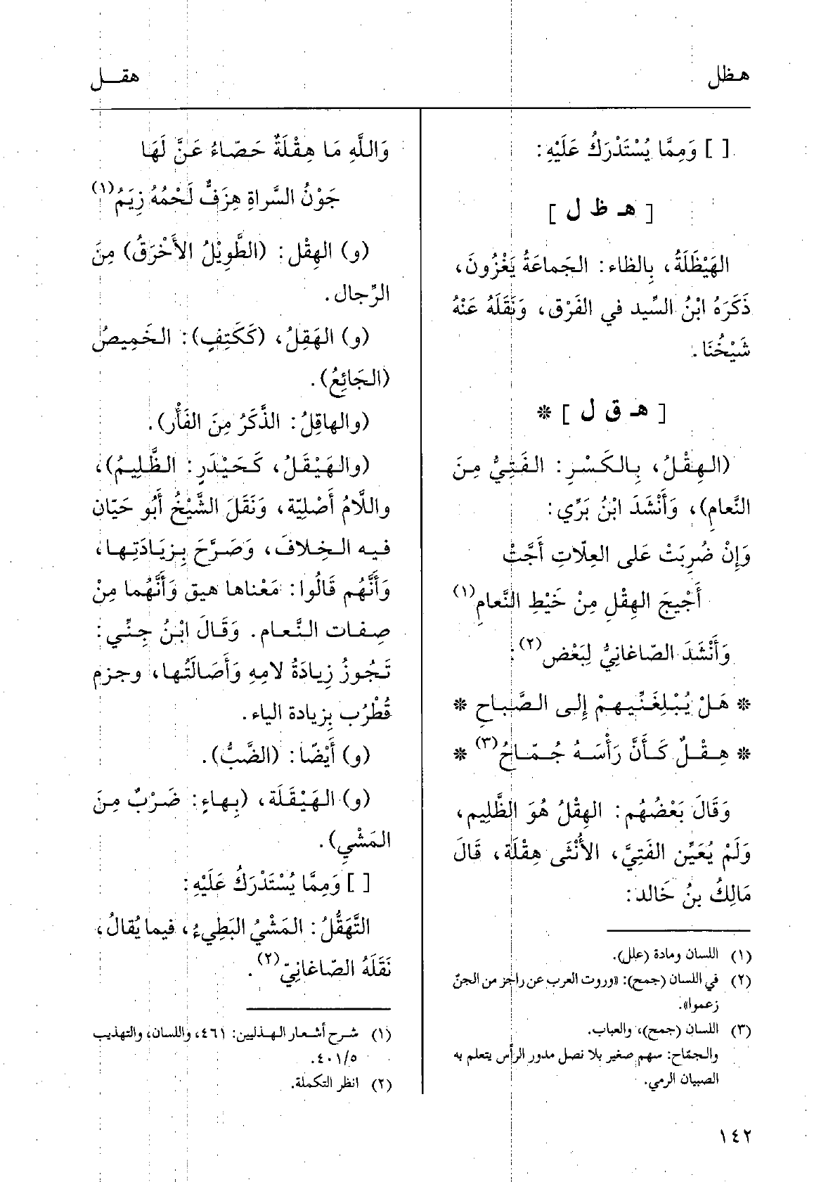 أَيْ: مَا هِيَ، فَلِهَذا دَخَلَتْ إِلَّا، انْتَهى. وَقَالَ الكِسائِي: وَتَأْتِي شَرْطاً، وتَأْتي تَوْبيخاً، وتَأْتي أَمْراً، وتَأءتي تَنْبِيهًا. (وَقَدْ أُدْخِلَتْ عَلَيْهَا أَلْ) فَتكون اسْما مُعْرَباً، وَقد (قيل لِأبِي الدُّقَيْش) الأَعْرابِيّ، وَقَد قِيْلَ لأِبِي الدُّقَيْش) الأَعْرابِيّ، القَائِلُ هُو الخَلِيْل: (هَلْ لَكَ فِي) ثَرِيْدَة كَأَنَّ وَدَكَها عُيُونُ الضَّياوِن؟ هذِهِ حِكَايَة الجَوْهَرِيّ عَن الخَليل، قَالَ ابْنُ بَرِّي: قَالَ ابْنُ حَمْزَة: رَوَى أَهْلُ الضَّبْطِ عَن الخَليل أَنَّهُ قَالَ لِأَبِي الدُّقَيْش أَوْ غَيْرِه: هَلْ لَكَ فِي (تَمْرٍ وَزُبْدٍ؟ . فَقالَ أَشَدُّ {الهَلِّ) وَأَوْحَاهُ، وَفِي رِوَايَة، أَنَّهُ قَالَ لَهُ: هَلْ لَكَ فِي الرُّطَبِ؟ قَالَ: أَسْرَع} هَلٍّ وَأَوْحاهُ، انْتَهَى. فَجَعَلَهُ أَبُو الدُّقَيْش اسْما كَمَا تَرَى وَعَرَّفَهُ بِالأَلِف واللَّام، وَزادَ فِي الاحْتِياط بِأَنْ (ثَقَّلَهُ) وَشَدَّدَهُ غَير مُضْطَرٍّ (لِيُكَمِّلَ عَدَدَ حُرُوفِ الأُصُولِ) وَهِيَ الثَلَاثَة، وَسَمِعَهُ أَبُو نُواسٍ فَتَلاهُ فَقَالَ لِلْفَضْلِ ابْن الرَّبِيع: