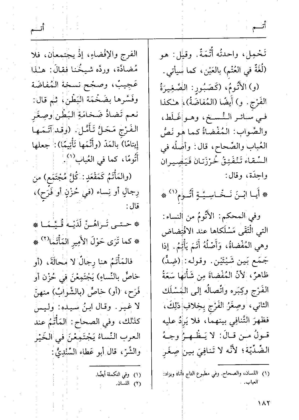 الإِمَام السُّهَيْلِيُّ فِي الرَّوْض ثَلاثَةَ أقوالٍ: سُرْيانِيّ أَو عِبْرانِيّ أَو عَرَبِىّ، من {الأُدْمَة أَو} الأَدِيم، كَمَا رُوِيَ عَن ابْن عَبَّاس. وَقَالَ قُطْرُب: لَو كَانَ من {أَدِيمِ الأَرْض لَكَانَ وَزْنُه فاعَلَ، والهَمْزَة أَصْلِية، فَلَا مانِعَ لِصَرْفه. ونَظَّر فِيهِ السُّهَيْلِيّ بِجَوازِ كَوْنِه من الْأَدِيم على وزن أَفْعَل بِإِدْخَال الْهمزَة الزَّائِدَة على الأصلِيّة. وَبسط القولَ فِيهِ الشِّهابُ فِي العِنايَة فِي أَوَائِل " البَقَرة ". (وَأَبُو بَكْرٍ أَحْمَدُ بنُ) مُحَمَّد بن (} آدَمَ) الشاشِيّ ( {الآدَمِيُّ) ، بالمَدِّ، نِسْبَة إِلَى جدِّه الْمَذْكُور: (مُحَدِّثٌ) رَحّالٌ، سَمِعَ مُحَمَّد بنَ عبدِ اللَّهِ الغزّي وَأَبا حاتِم، هَكَذَا ضَبَطه الْحَافِظ. (} والأَدَمانُ، محرّكة: شَجَرٌ) ، حَكَاهَا أَبُو حنيفَةَ، قَالَ: وَلم أَسْمَعْها إلّا من شُبَيْلِ بنِ عَزْرَةَ. (و) {الأَدَمانُ: (عَفَنٌ) فِي النَّخْل، كالدَّمانِ، وَسَيَأْتِي فِي مَوْضِعه. (و) قيل: الأَدَمانُ. (سَوادٌ فِي قَلْبِ النَّخْلَةِ) وَهُوَ وَدِيُّهُ، عَن كُراع، وَلم يقل أحدٌ فِي القَلْبِ إِنَّهُ الوَدِيُّ إِلَّا هُوَ. (} وأُدَمَى) على فُعَلَى، (و) {الأُدَمَى (باللاَّمِ كأُرَبَى) قَالَ ابنُ خالَوَيْة: لَيْسَ فِي كَلَام الْعَرَب فُعَلَى بِضَمٍّ فَفَتْح مَقْصُورا غيرُ ثلاثةِ أَلْفاظٍ: شُعَبَى اسْم مَوضِع، وأُرَبَى اسمٌ للداهِيَة، وأُدَمَى اسمُ (ع) ، وَأنْشد: