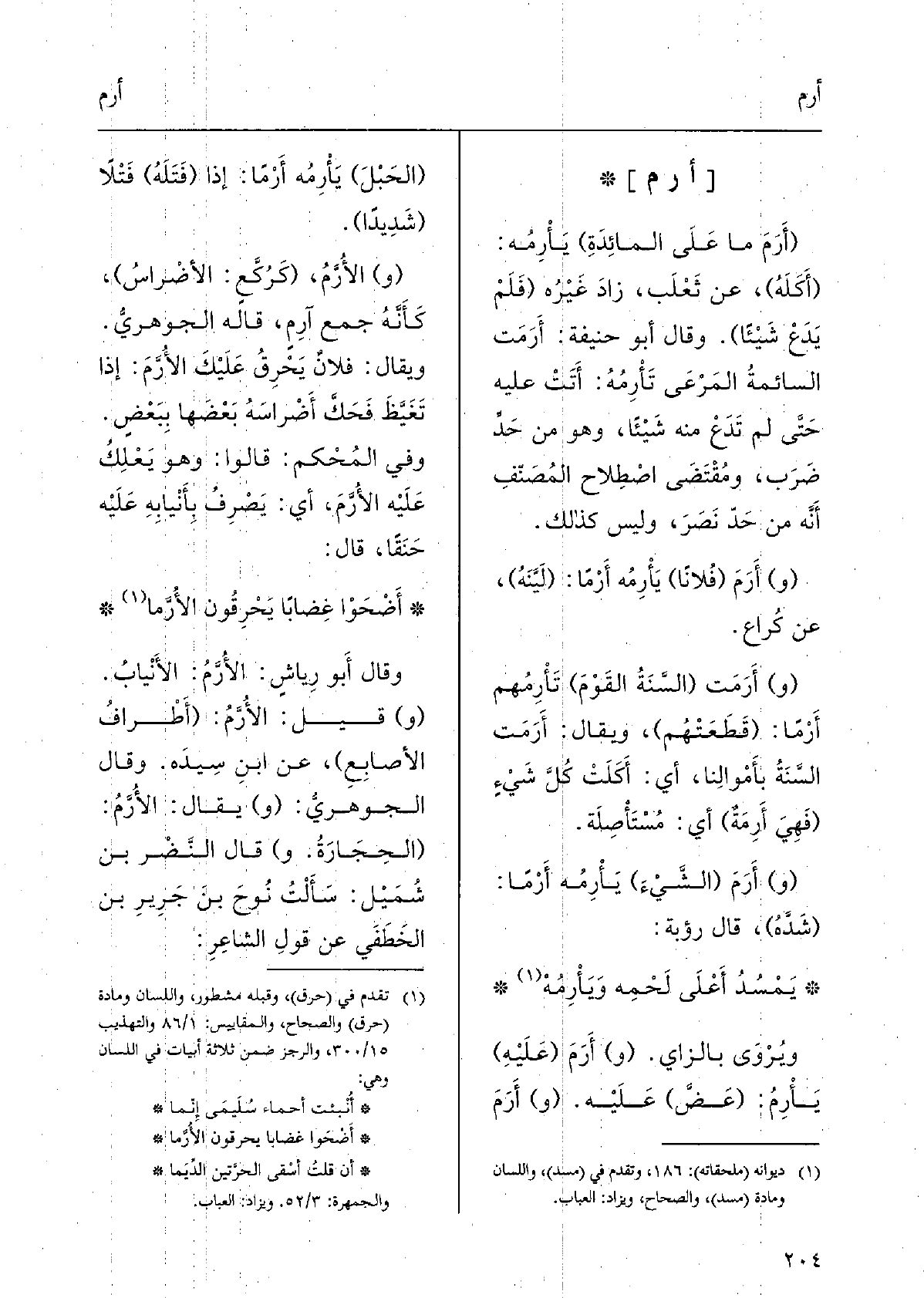 وَقَالَ ابنُ الأعرابيِّ:} الأُطُومُ، القُصُور، وَفِي حَدِيث بِلالٍ: " أَنَّه كانَ يُؤَذِّنُ على {أُطُمِ المَدِينَة ". وَفِي حَدِيث: " حَتّى تَوارَتْ} بِآطامِ المَدِينَة ". ( {وآطامٌ} مُؤَطَّمَةٌ، كَأَجْنادٍ مُجَنَّدَةٍ) ، وَفِي العُبابِ: كَأَبْوابٍ مُبَوَّبَة، وَفِي الأساس: أَي: مُرْتَفِعَة. ( {وَأَطِمَ، كَفَرِحَ) } أَطَمًا؛ أَي: (غَضِبَ) ، كَأَزِمَ، (و) أَيْضًا (انْضَمَّ) . ( {والأَطِيمَةُ) ، كَسَفِينَةٍ: (مَوْقِدُ النَّار) ، وجُمْعُها:} أَطائِمُ، قَالَ الأَفْوَهُ الأَوْدِيّ: