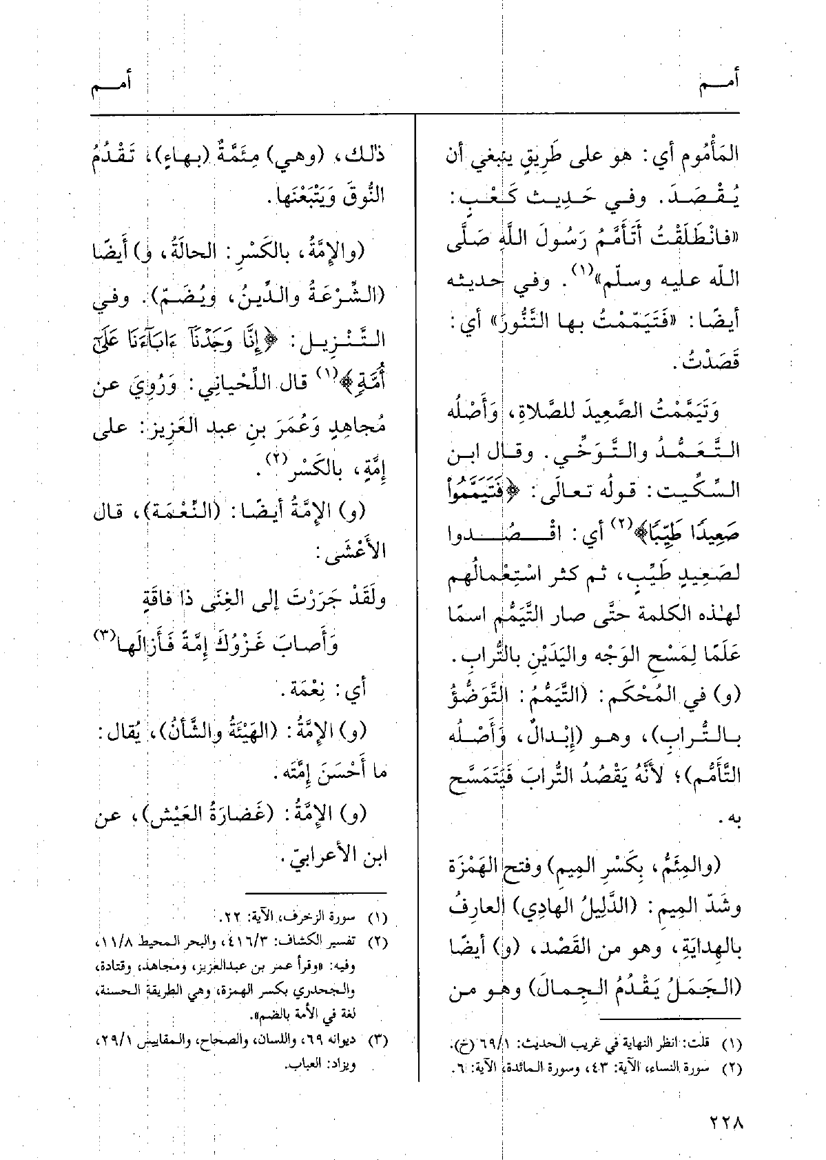 وَبَعُدَ عَن الحُرُوفِ وَحَصَلَ طَرَفًا فَكَانَ النُّطْقُ بِهِ تَكَلُّفا، فَإِذا كُرِهَت الهمزةُ الواحِدةُ، فَهُمْ باسْتِكْراه الثِّنْتَيْن وَرَفْضِهما - لَا سِيَّما إِذا كَانَتَا مُصْطَحِبَتَيْن غَيْر مُفْتَرِقَتَيْن فَاء وَعَيْنًا أَو عَيْنًا ولامًا - أَحْرَى، فَلهَذَا لم يَأْتِ فِي الْكَلَام لَفْظَةٌ تَوالَتْ فِيها هَمْزتان أَصْلًا البَتَّة. فأمّا مَا حَكَاهُ أَبُو زَيْدٍ من قَوْلهم دَرِيئَةٌ ودَرائِيٌ وَخَطِيئَةٌ وخَطائِيٌ فشاذٌّ لَا يُقاسَ عَلَيْهِ، وَلَيْسَت الهمزتان أَصْلَيْنِ بل الأُولَى مِنْهُمَا زَائِدَة، (و) كَذَلِك قِراءةُ أَهْلِ الكُوفَة {فَقَاتلُوا {أَئِمَّة الْكفْر} بهمزتَيْن (شاذٌّ) لَا يُقاس عَلَيْهِ. وَقَالَ الجوهريّ جمع} الإِمَام أَأْمِمَة على أَفْعِلَة، مثل إناءٍ وآنِيَةٍ وَإِلهٍ وَآلِهَةٍ، فَأُدغمت الميمُ، فنُقِلَت حركتها إِلَى مَا قَبْلَها، فلمَّا حركوها بِالْكَسْرِ جعلوها يَاء. وَقَالَ الْأَخْفَش: جُعِلَت الهَمْزةُ يَاء؛ لأنّها فِي مَوضِع كَسْرٍ وَمَا قبلهَا مفتوحٌ فَلم تُهْمَزْ لِاجْتِمَاع الهَمْزَتَيْن. قَالَ: وَمَنْ كَانَ من رَأْيِه جَمْعُ الهَمْزَتَيْن هَمَزَهُ، انْتهى. وَقَالَ الزجّاج: الأصلُ فِي {أَئِمَّة أَأْمِمَة؛ لأنَّه جمعُ} إِمامٍ كَمِثالٍ وَأَمْثِلة، ولكنّ المِيمَيْن لمّا اجتمعتا أُدْغِمت الأُولَى فِي الثَّانِيَة وَأُلْقِيَت حَرَكَتُها على الهَمْزَةِ فَقِيلَ أَئِمَّة، فَأَبْدلت العربُ من الهمزةِ الْمَكْسُورَة الياءَ. (و) {الإِمامُ: (الخَيْطُ) الَّذِي (يُمَدُّ على البِناءِ فَيُبْنَى) عَلَيْهِ، ويُسَوّى عَلَيْهِ سافُ البِناءِ، قَالَ يصف سَهْمًا: