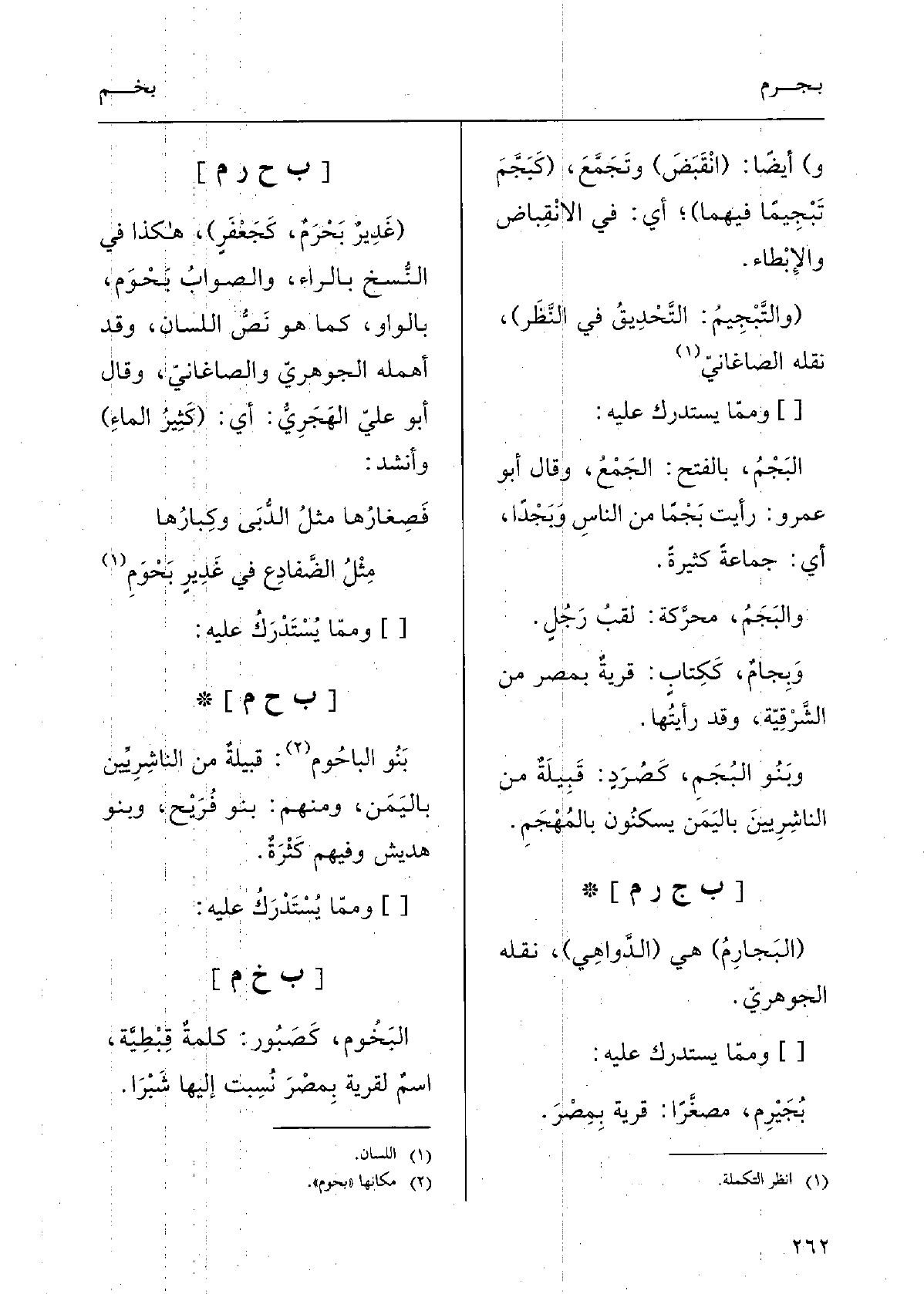 (والبرشوم) ضرب من النّخل واحدته برشومة بِالضَّمِّ لَا غير قَالَ ابْن دُرَيْد لَا أَدْرِي مَا صِحَّته وَقَالَ أَبُو حنيفَة البرشوم جنس من التَّمْر وَقَالَ مرّة البرشومة بِالضَّمِّ (وَيفتح أبكر النّخل بِالْبَصْرَةِ) وَقَالَ ابْن الْأَعرَابِي البرشوم من الرطب الشقم وَرطب البرشوم يتَقَدَّم عِنْد أهل الْبَصْرَة على رطب الشهريز وَيقطع عذقه قبله [] وَمِمَّا يسْتَدرك عَلَيْهِ برشوم بِالضَّمِّ والعامة تفتح قَرْيَة بِمصْر يجلب مِنْهَا التِّين الحيد وَقد دَخَلتهَا وبريشيم مصغرة قَرْيَة أُخْرَى صَغِيرَة بالمنوفية وَقد رَأَيْتهَا أَيْضا [ب ر ص م] (البرصوم بِالضَّمِّ) أهمله الْجَوْهَرِي وَقَالَ ابْن دُرَيْد هُوَ (عفاص القارورة وَنَحْوهَا) فِي بعض اللُّغَات [ب ر ط م] (البرطام بِالْكَسْرِ الضخم الشّفة كالبراطم) كعلابط وَاقْتصر الْجَوْهَرِي على الأولى (و) البرطام (الشّفة الضخمة) وَالِاسْم البرطمة كَمَا فِي الْمُحكم (و) البرطم (كجعفر العيي اللِّسَان) نَقله الصَّاغَانِي (والبرطمة الانتفاخ غَضبا) قَالَ