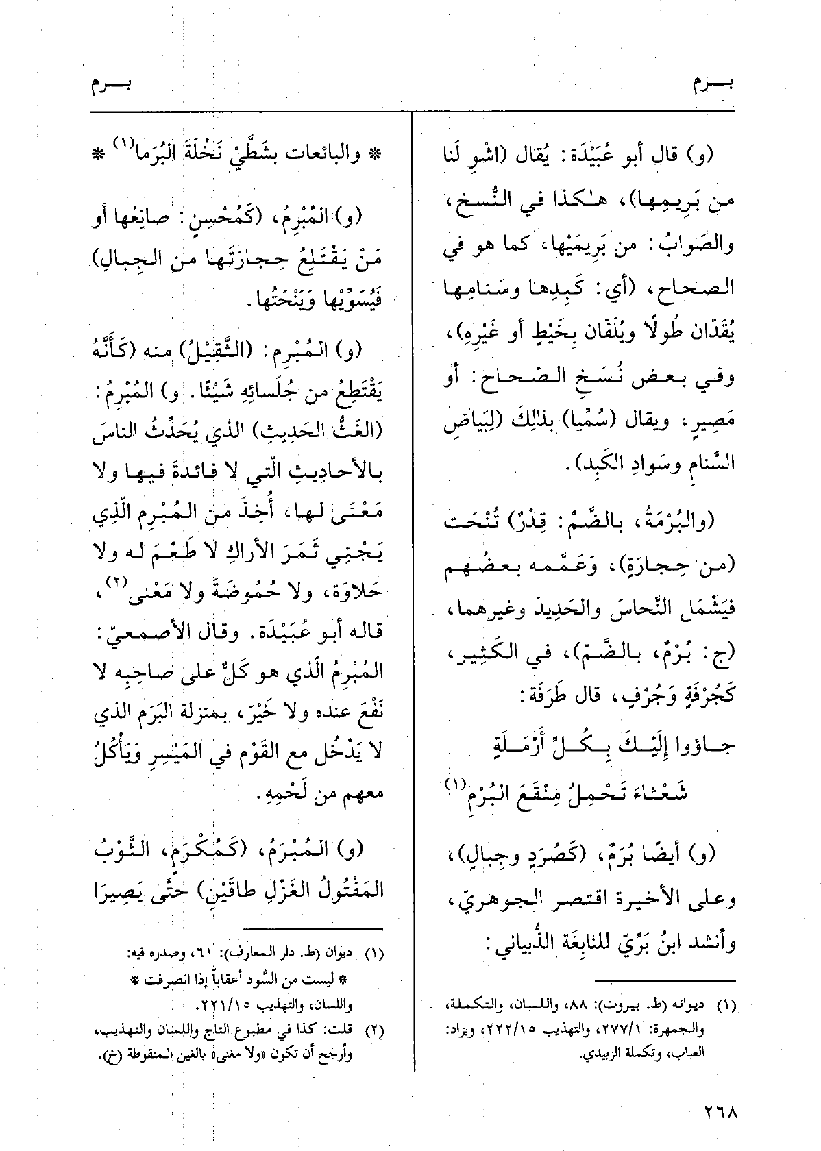 فيروى بِالْبَاء وبالراء وَيُقَال هُوَ باقة بقل وَيُقَال هُوَ فضلَة الزَّاد وَيُقَال هُوَ الطّلع يشق ليلقح ثمَّ يشد بخوصة (والابزام والابزيم بكسرهما الَّذِي فِي رَأس المنطقة وَمَا أشبهه وَهُوَ ذُو لِسَان يدْخل فِيهِ الطّرف الآخر) وَقَالَ ابْن شُمَيْل الْحلقَة الَّتِي لَهَا لِسَان يدْخل فِي الْخرق فِي أَسْفَل الْمحمل ثمَّ تعض عَلَيْهَا حلقتها وَالْحَلقَة جَمِيعًا إبزيم وَأَرَادَ بالمحمل حمائل السَّيْف وَقَالَ ابْن بري الابزيم حَدِيدَة تكون فِي طرف حزَام السرج يسرج بهَا قَالَ وَقد تكون فِي طرف المنطقة قَالَ مُزَاحم