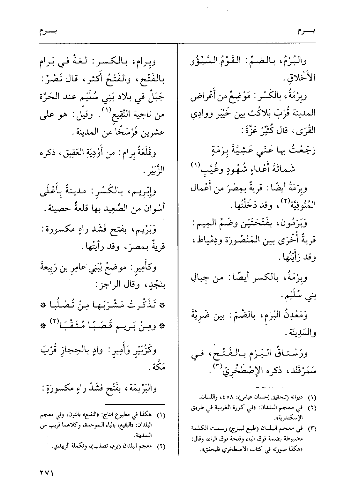 وَأَبُو البسام مُوسَى بن عبد الله بن يحيى بن جَعْفَر الْمُصدق الْحُسَيْنِي الْكُوفِي دخل الأندلس مُجَاهدًا كَذَا فِي تَارِيخ الذَّهَبِيّ وَاسْتشْهدَ فِي بِلَاد بني حَمَّاد سنة أَرْبَعمِائَة وست وَثَمَانِينَ وَهُوَ جد الْحَافِظ أبي الْخطاب بن دحْيَة لأمه وَهِي أمة عبد الرَّحْمَن ابْنة مُحَمَّد ابْن مُوسَى هَذَا وَلذَا كَانَ يكْتب فِي نسبه ذُو النسبين وَقد ذكرنَا أَبَا البسام هَذَا فِي المشجر فَرَاجعه [ب س ط م] (بسطَام بِالْكَسْرِ ابْن قيس بن مَسْعُود) الشَّيْبَانِيّ قَالَ الْجَوْهَرِي هُوَ لَيْسَ من أَسمَاء الْعَرَب وَإِنَّمَا سمي قيس بن مَسْعُود ابْنه بسطاما باسم ملك من مُلُوك فَارس كَمَا سموا قَابُوس ودختنوس فعربوه بِكَسْر الْبَاء قَالَ ابْن بري إِذا ثَبت أَن بسطَام اسْم رجل مَنْقُول من اسْم بسطَام الَّذِي هُوَ اسْم ملك من مُلُوك فَارس فَالْوَاجِب ترك صرفه للعجمة والتعريف قَالَ وَكَذَلِكَ قَالَ ابْن خالويه لَا يَنْبَغِي أَن يصرف (و) بسطَام (د) بقومس على طَرِيق نيسابور (وَيفتح أَو) هُوَ (لحن) أَي الْفَتْح قَالَ الصَّاغَانِي (وَلم ير بِهِ رمد وَلَا عاشق وَإِن ورد مسلا مِنْهُ الْعَارِف) بِاللَّه تَعَالَى القطب (أَبُو يزِيد) طيفور بن عِيسَى بن سروشان الزَّاهِد كَانَ جده مجوسيا فَأسلم على يَدي الإِمَام عَليّ بن مُوسَى الرِّضَا وَهَذَا هُوَ الْمَعْرُوف