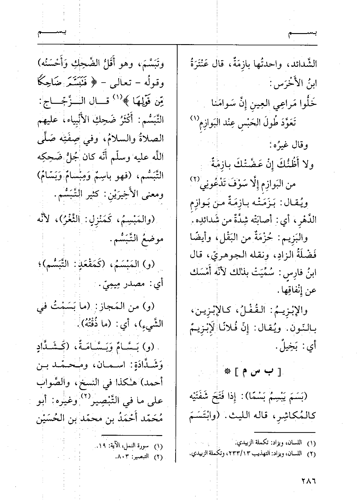 وبالام جَاءَ ذِكْرُه فِي حَدِيث: ((طَعامُ أَهْلِ الجَنَّة بالامٌ ونُونٌ)) وفَسّره عِياضٌ والخَطّابِيُّ بالثَّوْرِ، والنُّون: الحُوتُ. قَالُوا: وَهِي لفظةٌ عِبْرانِيّةٌ.