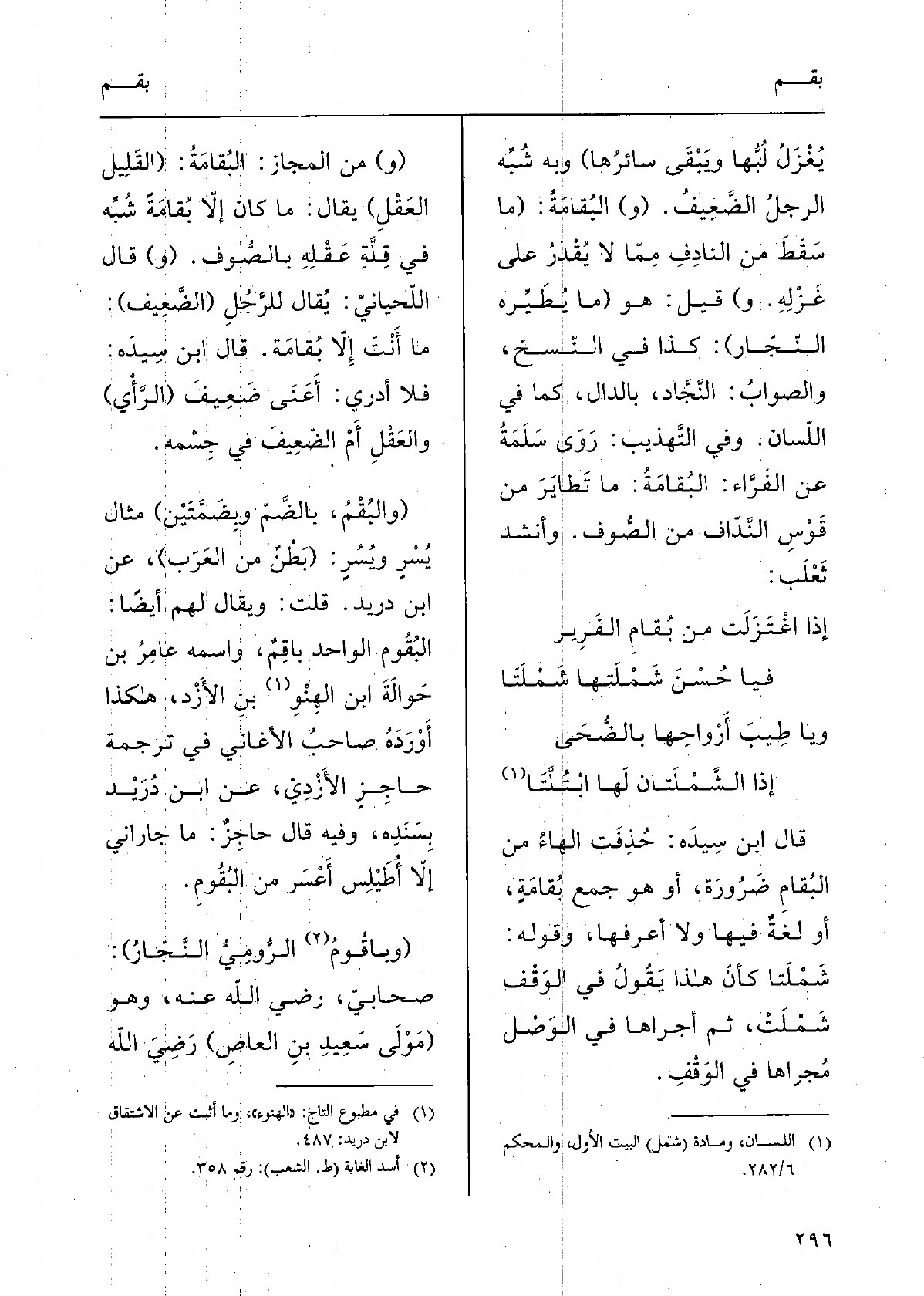 قَالَ: ولمّا سُئل ابنُ عباسٍ عَن قَوْله - تعالَى - {وَأُمَّهَتُ نِسَائِكُمْ} وَلم يُبَيِّن اللَّهُ الدُّخولَ بِهِنَّ أجابَ فَقَالَ: هَذَا من مُبْهَمِ التَّحْرِيم الَّذِي لَا وَجْهَ فِيهِ غَيْر التَّحْرِيم، سواءٌ دَخَلْتُم بالنّساءِ أَو لَمْ تَدْخُلُوا بهنّ، فأُمَّهاتُ نِسائكم حُرِّمْنَ عَلَيْكُم من جَمِيع الجِهات. وَأما قَوْله: {وَرَبَئِبُكُمُ الَّتِي فِي حُجُورِكُم مِّن نِّسَائِكُمُ الَّتِي دَخَلْتُم بِهِنَّ} فالربائبُ هُنَا لسْن من المُبْهَمات، لأنَّ لَهُنَّ وَجْهَيْن مُبَيَّنَيْن أُحْلِلْن فِي أَحَدِهما وَحُرِّمْنَ فِي الآخَرِ، فَإِذا دُخِلَ بِأُمَّهاتِ الرِّبائبِ حَرُمَت الرّبائبُ، وإنْ لم يُدْخَل بِأُمَّهات الرَّبائبِ لم يَحْرُمْن. فَهَذَا تَفْسِير المُبْهَم الَّذِي أَرَادَ ابنُ عَبّاسٍ، فافْهَمْه. قَالَ ابنُ الْأَثِير: وَهَذَا التَّفْسِير من الأَزْهَرِيِّ إِنّما هُوَ للرَّبائب والأُمَّهات لَا لِلْحلائل، وَهُوَ فِي الحَدِيث إِنّما جَعَلَ سؤالَ ابنِ عَبّاس عَن الحَلائل لَا عَن الرَّبائب. (ج: بُهْمٌ، بالضَّمِّ وبِضَمَّتَيْن) هَكَذَا فِي النُّسَخ، وَلَعَلَّ فِي الْعبارَة سقطا أَو تَقْدِيمًا وتأخيرًا فإنّ هَذَا الْجمع إنّما ذَكرُوهُ للبَهِيم بِمَعْنى النَّعْجة السَّوداء، فَتَأَمَّل ذَلِك.