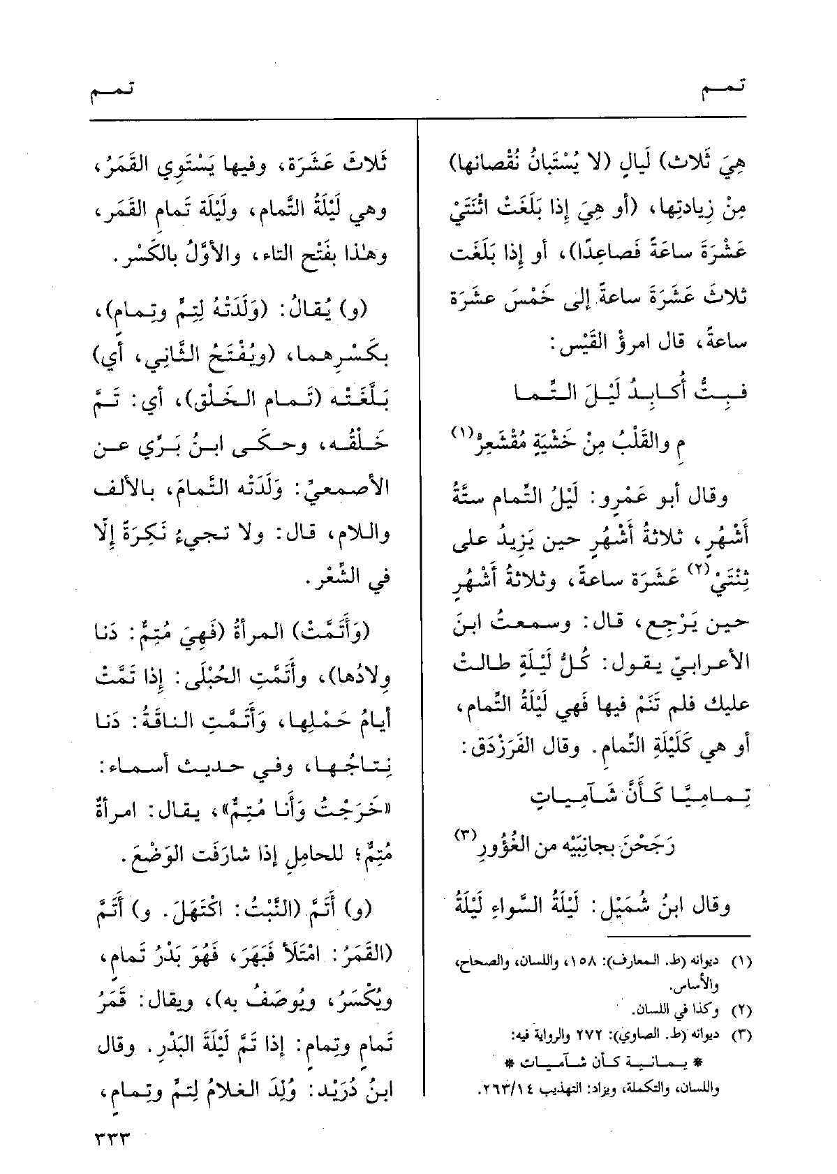 يَقُول: جارَتُهم لَا تَحْتاج أنْ تَذْبَح {تِيمَتَها لأنَّهم يَضْمَنُونَ لَهَا قِراها، فَهِيَ مُسْتَغْنِيَةٌ عَن ذبْح تِيمَتِها. وَقَالَ أَبُو الهَيْثَم: الاتّيِامُ: أَنْ يَشْتَهِيَ القَوْمُ اللَّحْمَ فَيَذْبَحوا شَاة من الغَنَم، فتِلْكَ يُقال لَهَا} التِّيْمَةُ تُذْبَح من غَيْرِ مَرَضٍ.