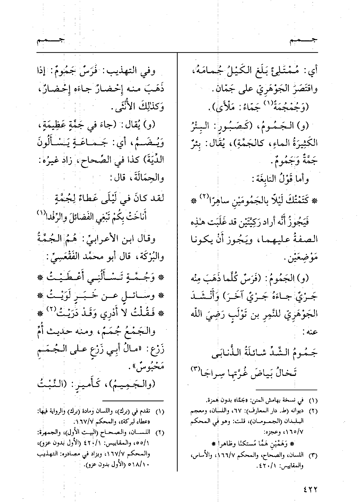 قالَ: وَله كِتابٌ فِي اللُّغَة سَمَّاه الجِيم، كَأَنَّهُ شَبَّهَه بالدِّيباجِ لحُسْنِه، وَله حِكايَةٌ حَسَنَةٌ مَشْهُورَة، انْتهى. فَلَو قالَ المُصَنِّف هُنَا: والدِّيباجُ؛ ثمَّ قالَ: عَن أبي عَمْرٍ وَفِي كِتاب الجِيم، لكانَ مُفِيداً مُخْتَصرا. وقولُه: سَمِعْتُه إِلَى آخِرِه يَدُلُّ على أَنَّ المصنِّفَ لم يَطَّلِع على كِتابِ الجِيمِ، كَمَا هُوَ ظِاهرٌ. وكَلامه فِي البصائِر محتمِلٌ أنّه نَقَلَه مِنْهُ بِلَا واسِطَةٍ أَو نَقَلَ مِمَّن نَقَلَه مِنْهُ، فتأَمَّل.