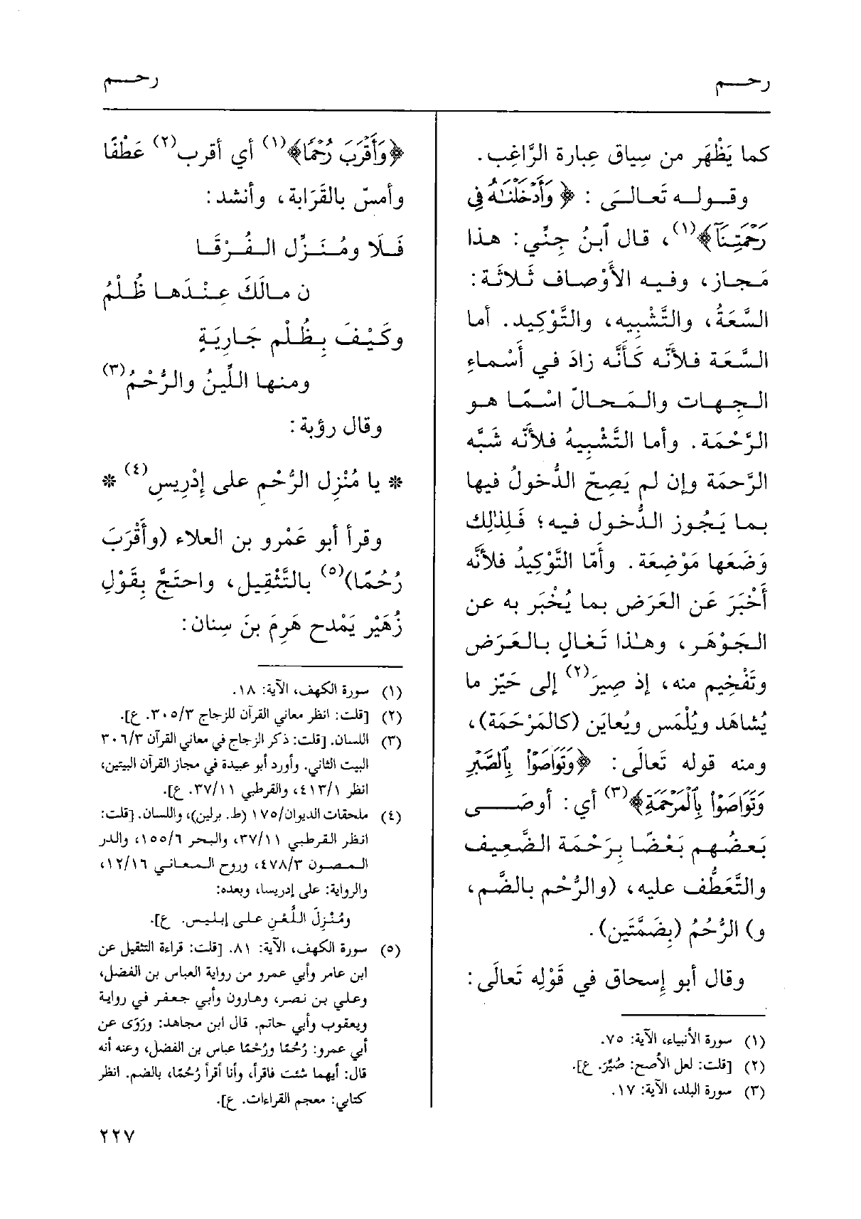 وَقَوله تَعالَى: {وَأَدْخَلْنَاهُ فِي رَحْمَتنَا} ، قَالَ ابنُ جِنِّي: هَذَا مَجاز، وَفِيه الأَوْصاف ثَلاثَة: السَّعَةُ، والتَّشْبِيه، والتَّوْكِيد. أما السَّعَة فلأَنّه كأَنّه زادَ فِي أَسْماءِ الجِهات والمَحالّ اسْمًا هُوَ الرَّحْمَة. وَأما التَّشْبِيهُ فلأَنَّه شَبَّه الرَّحْمَة وَإِن لم يَصِحّ الدُّخُول فِيهَا بِمَا يَجوُز الدُّخول فِيهِ؛ فَبِذلِك وَضَعَها مَوْضِعَة. وأَمّا التَّوْكِيدُ فلأَنَّه أَخْبَرَ عَن العَرَض بِمَا يُخْبَر بِهِ عَن الجَوْهَر، وَهَذَا تَغالٍ بالعَرَض، وتَفْخِيم مِنْهُ، إِذْ صِيَر إِلَى حَيّز مَا يُشاهَد ويُلْمَس ويُعايَن (كالمَرْحَمَة) ، وَمِنْه قَوْله تَعالَى: {وَتَوَاصَوْا بِالصبرِ وَتَوَاصَوْا بالمرحمة} أَي: أوصَى بَعضُهم بَعْضًا بِرَحْمة الضَّعِيف والتَّعَطُّف عَلَيْهِ، (والرُّحْم بالضَّم، و) الرُّحُمُ (بِضَمَّتَين) .