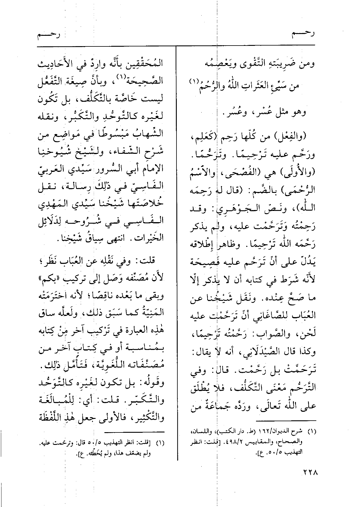 (والفِعْل) من كُلّها رَحِم (كَعَلِم، ورَحَّم عَلَيْهِ تَرْحِيماً. وتَرَحُّمًا. (والأُولَى) هِيَ (الفُصْحَى، والاسْمُ الرُّحْمَى) بالضَّم: (قَالَ لَهُ رَحِمَه الله) ، ونَصّ الجَوْهَرِي: وَقد رَحِمْتُه وتَرَحَّمْت عَلَيْهِ، وَلم يذكر رَحَّمَه الله تَرْحِيماً. وَظَاهر إطْلاقه يَدُلّ على أنّ تَرَحَّم عَلَيْهِ فَصِيحَة لأَنّه شَرَط فِي كِتَابه أَن لَا يذكر إلاّ مَا صَحَّ عِنْده. ونَقَل شَيْخُنا عَن العُبَاب للصَّاغَانِي أنّ تَرَحَّمْت عَلَيْهِ لَحْن، والصِّواب: رَحَّمْتُه تَرْحِيماً، وَكَذَا قَالَ الصَّيْدَلاَنِي، أَنه لَا يُقَال: تَرَحَمَّتْ بل رَحَّمْت. قَالَ: وَفِي التَّرَحُّم مَعْنَى التّكَلُّف، فَلَا يُطْلَق على الله تَعالَى، ورَدَّه جَماعَةٌ من المُحَقِّقِين بأَنَّه وارِدٌ فِي الأَحَادِيث الصَّحِيحَة، وبأَنَّ صِيغَة التَّفَعُّل لَيست خَاصَّة يالتَّكَلُّف، بل تَكُون لغَيْره كالتَّوحُّدِ والتَّكَبُّر، وَنَقله الشِّهابً مَبْسُوطًا فِي مَواضِع من شَرْحِ الشّفاء، ولشَيْخ شُيُوخِنا الإِمَام أبي السُّرور سَيِّدي العَربيّ الفَاسِيّ فِي ذلِك رِسالة، نقل خُلاصَتَها شَيْخُنا سَيِّدي المَهْدِي الفَاسِي فِي شُروحه لِدَلائِل الخَيْرات. انْتهى سِياقُ شَيْخِنا.