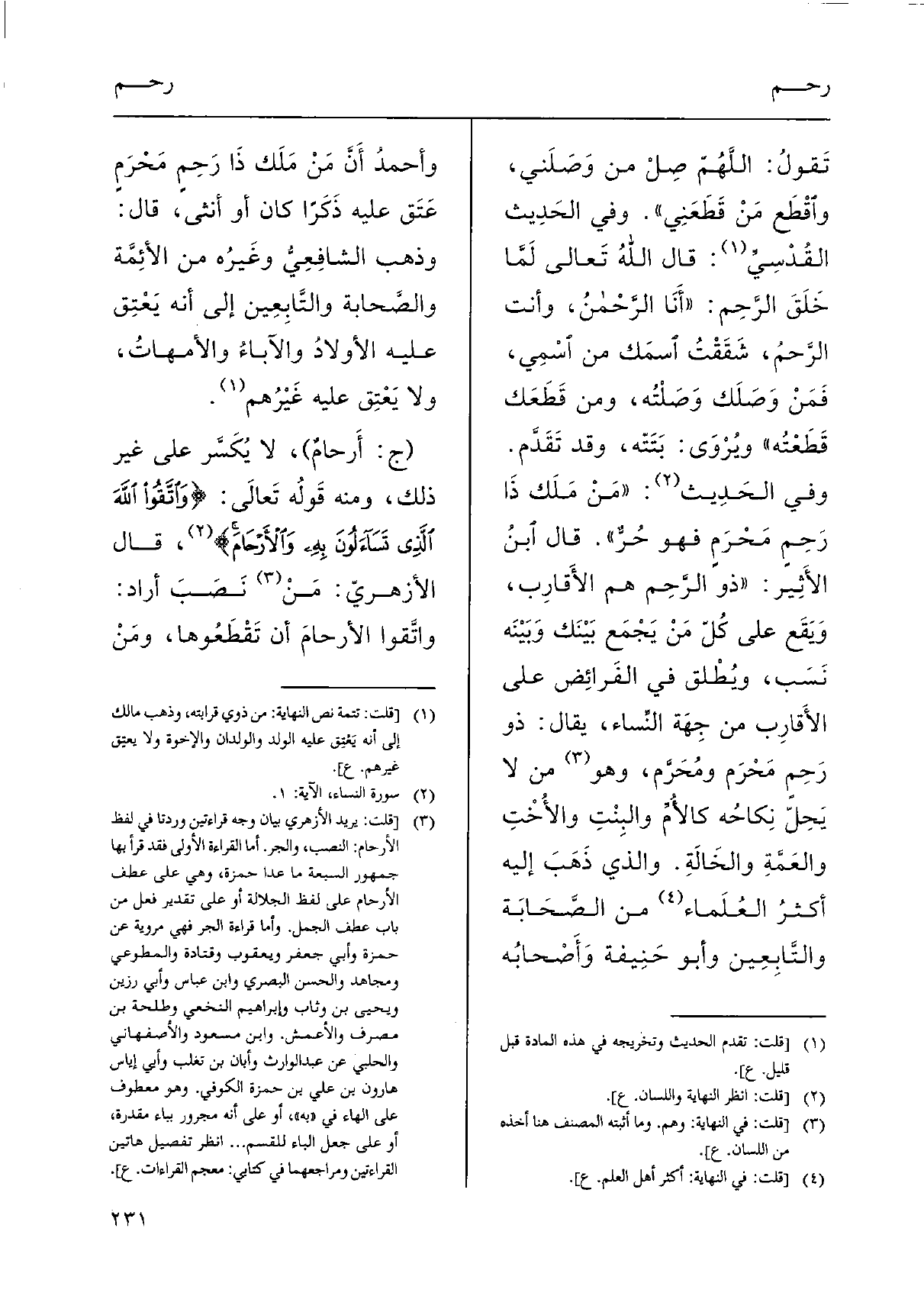 تَقولُ: اللَّهُمّ صِلْ من وَصَلَني، واقْطَع مَنْ قَطَعَنِي ". وَفِي الحَدِيث القُدْسِيِّ: قَالَ اللهُ تَعالى لَمِّا خَلَقَ الرَّحِم: " أَنا الرَّحْمنُ، وَأَنت الرَّحمُ، شَقَقْتُ اسمَك من اسْمِي، فَمَنْ وَصَلَك وَصَلْته، وَمن قَطَعَك قَطَعْتُه " ويُرْوَى: بَتَتّه، وَقد تَقَدَّم. وَفِي الحَدِيث: " مَنْ مَلَك ذَا رَحِم مَحْرَمٍ فَهُوَ حُرٌّ ". قَالَ ابنُ الأَثِير: " ذُو الرَّحِم هُوَ الأَقارِب، وَيَقَع على كُلّ مَنْ يَجْمَع بَيْنَك وَبَيْنَه نَسَب، ويُطْلق فِي الفَرائِض على الأَقارب من جِهَة النِّساء، يُقَال: ذُو رَحِمٍ مَحْرَم ومُحَرَّم، وَهُوَ من لَا يَحِلّ نِكاحُه كالأُمِّ والبِنْتِ والأَخْتِ والعَمَّةِ والخَالَةِ. وَالَّذِي ذَهَب إِلَيْهِ أكثرُ العُلَماء من الصَّحَابَة والتَّابِعيِن وَأَبُو حَنِيفة وَأصْحابُه وأحمدُ أَنَّ مَنْ مَلَك ذَا رَحِم مَحْرَمٍ عَتَق عَلَيْهِ ذَكَرًا كَانَ أَو أُنْثَى، قَالَ: وَذهب الشافِعِيُّ وغَيرُه من الأئِمَّة والصَّحابة والتَّابِعِين إِلَى أَنه يَعْتِق عَلَيْهِ الأولادُ والآباءُ والأمهاتُ، وَلَا يَعْتِق عَلَيْهِ غَيْرُهم.