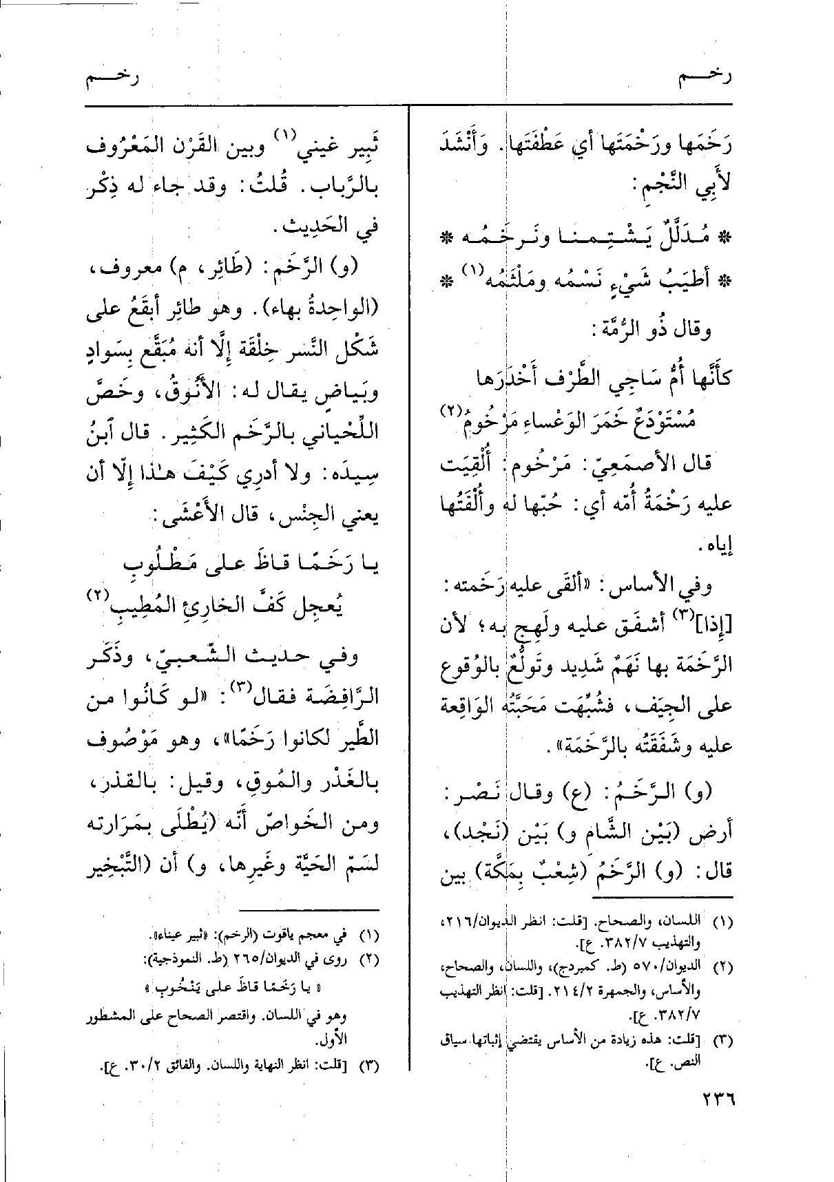 (و) الرَّخَم: (طَائِر، م) مَعْرُوف، (الواحِدةُ بهاء) . وَهُوَ طائِر أبقَعُ على شَكْل النِّسر خِلْقَة إِلاَّ أَنه مُبَقَّع بِسَوادٍ وبَياضٍ يُقَال لَهُ: الأنًوقُ، وخَصَّ اللِّحْياني بالرَّخَم الكَثِير. قَالَ ابنُ سِيدَه: وَلَا أدرِي كَيْفَ هَذَا إِلاَّ أَن يَعْنِي الجِنْس، قَالَ الأَعْشَى: