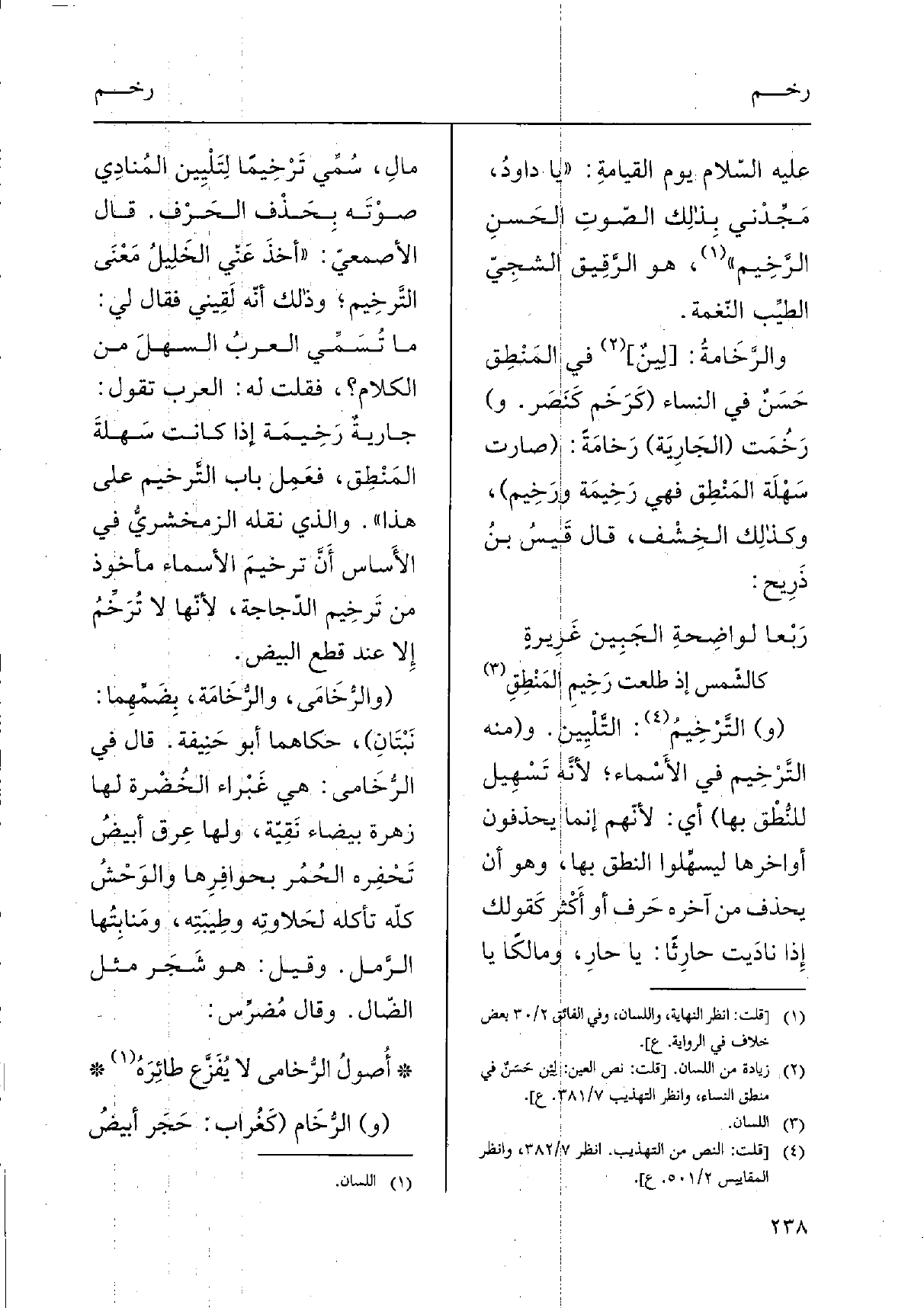 (و) التَّرْخِيمُ: التَلْيِين. و (مِنْهُ التَّرْخِيم فِي الأَسْماء؛ لأنَّه تَسْهِيل للنُّطْق بهَا) أَي: لأنّهم إِنَّمَا يحذفون أواخرها ليسهِّلوا النُّطْق بهَا، وَهُوَ أَن يحذف من آخِره حَرف أَو أَكْثر كَقولك إِذا نادَيت حارِثًا: يَا حارِ، ومالكًا يَا مالِ، سُمِّي تَرْخِيمًا لِتَلْيِين المُنادِي صوْتَه بَحَذْف الحَرْف. قَالَ الأصمعيّ: " أخذَ عَنّي الخَلِيلُ مَعْنَى التَّرخِيم؛ وَذَلِكَ أنّه لَقِيني فَقَالَ لي: مَا تُسَمِّي العربُ السهلَ من الْكَلَام؟ ، فَقلت لَهُ: الْعَرَب تَقول: جاريةٌ رَخِيمَة إِذا كَانَت سَهلةَ المَنْطِق، فعَمِل بَاب التّرخيم على هَذَا ". وَالَّذِي نَقله الزمخشريُّ فِي الأَساس أَنَّ ترخيمَ الْأَسْمَاء مَأْخُوذ من تَرخِيم الدّجاجة، لأنّها لَا تُرَخِّمُ إِلا عِنْد قطع الْبيض.
