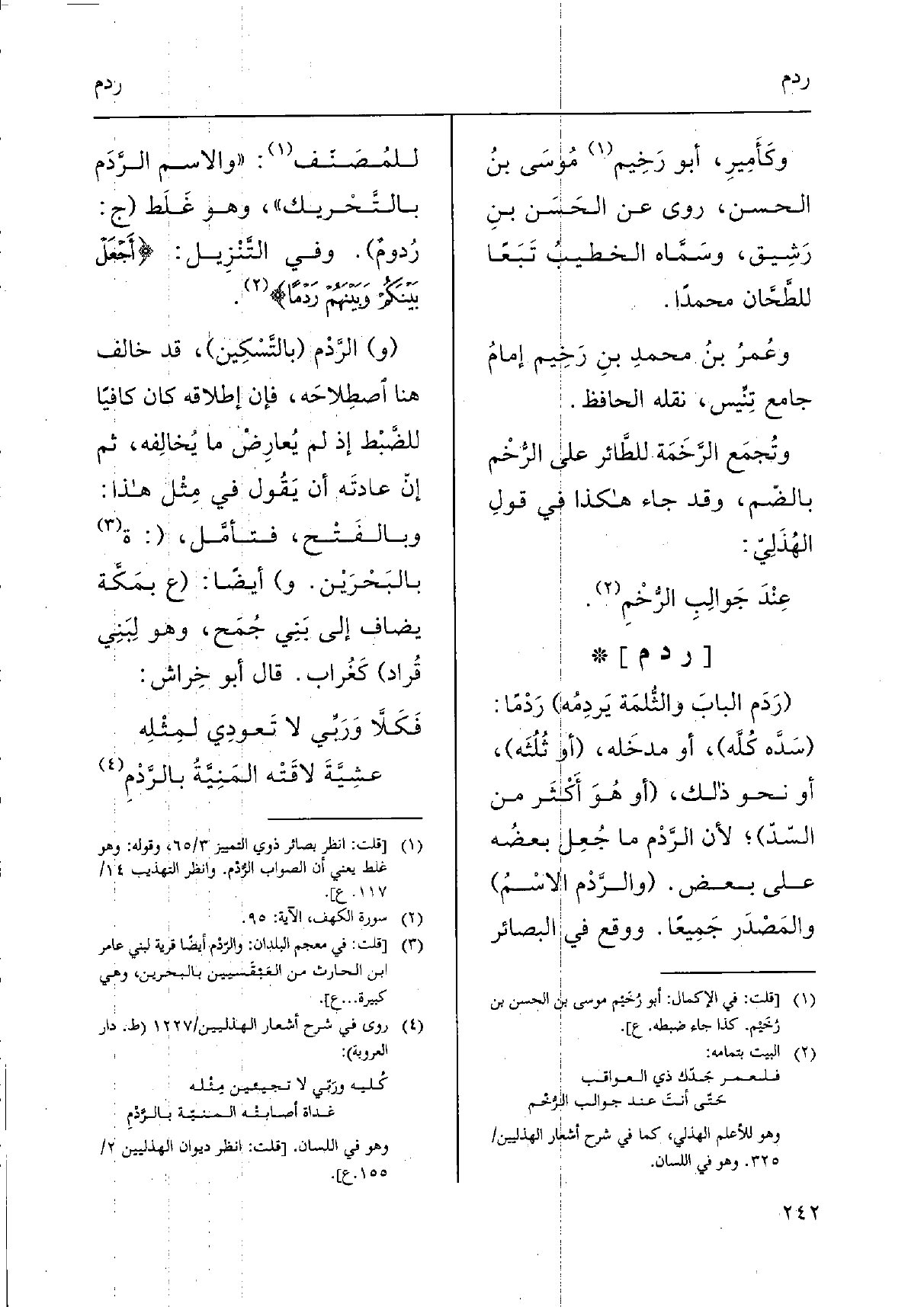 (و) الرَّدم (بالتَّسْكِين) ، قد خَالف هُنَا اصطِلاحَه، فَإِن إِطْلَاقه كَانَ كَافِيا للضَّبْط إِذْ لم يُعارِضْ مَا يُخالِفه، ثمَّ إنّ عادتَه أَن يَقُول فِي مِثْل هَذَا: وبالفَتْح، فتأمَّل، (: ة بالبَحْرَيْن. و) أَيْضا: (ع بمَكَّة يُضَاف إِلَى بَنِي جُمح، وَهُوَ لِبَنِي قُراد) كَغُراب. قَالَ أَبُو خِراش: