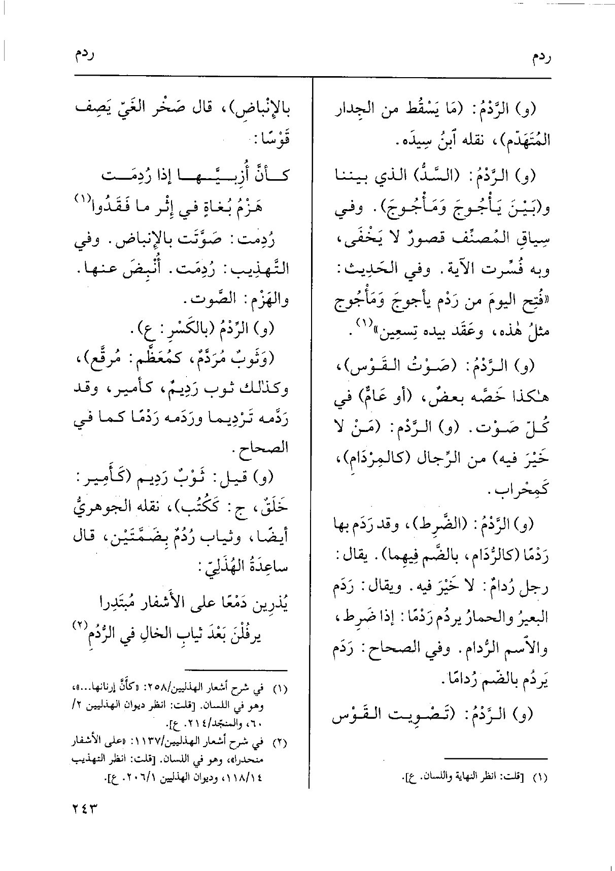 (و) قيل: ثَوْبٌ رَدِيم (كَأَمِير: خَلَقٌ، ج: كَكُتُب) ، نَقله الجوهريُّ أَيْضا، وَثيَاب رُدُمٌ بِضَمَّتَيْن، قَالَ ساعِدَةُ الهُذَلِيّ: