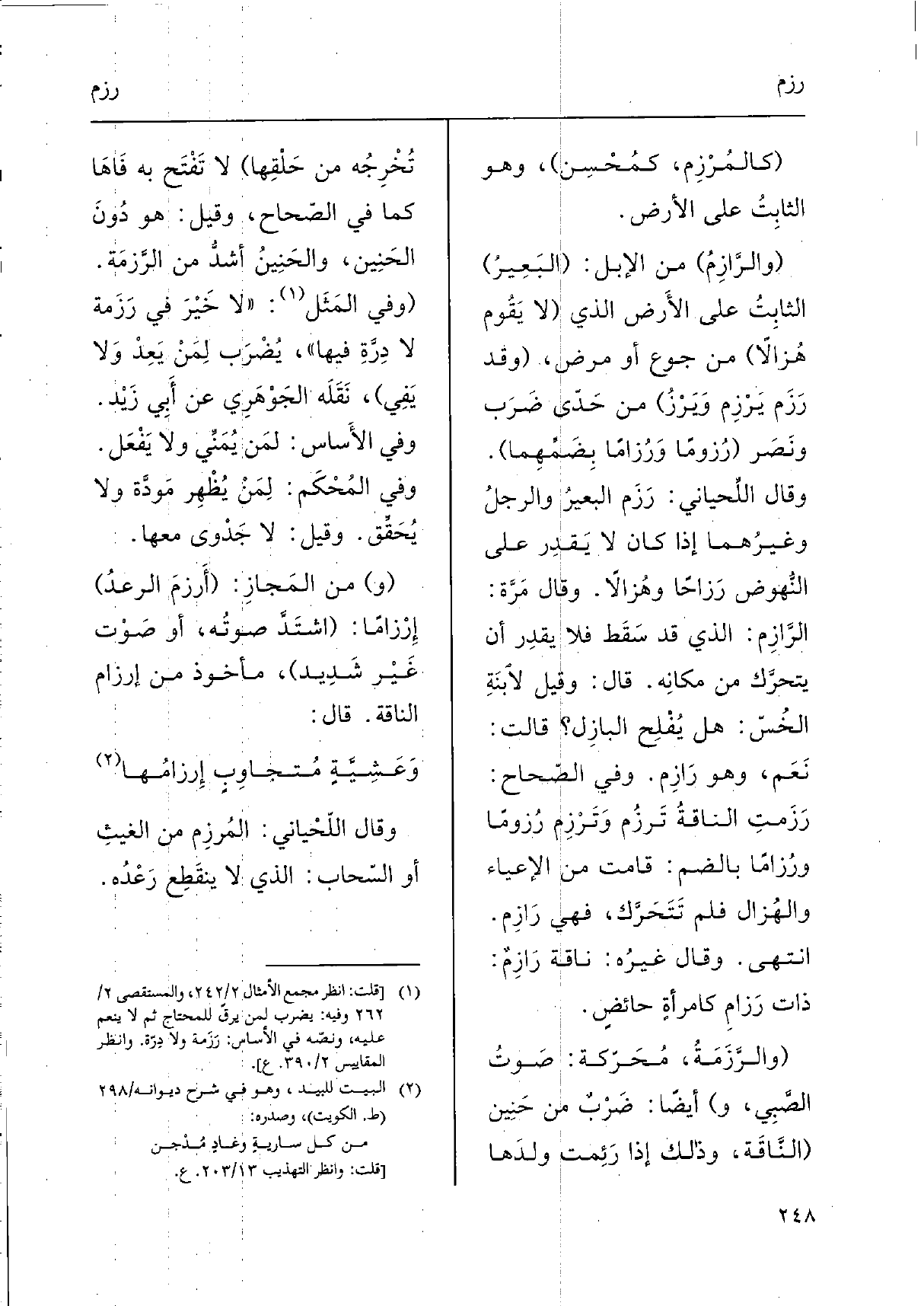 (والرَّازِمُ) من الْإِبِل: (البَعِيرُ) الثابِتُ على الأَرض الَّذِي (لَا يَقُوم هُزالاً) من جوع أَو مرض، (وَقد رَزَم يَرْزِم وَيَرْزُ) من حَدّى ضَرَب ونَصَر (رُزوماً وَرُزاماً بِضَمِّهِما) . وَقَالَ اللِّحياني: رَزَم البعيرُ والرجلُ وغيرُهما إِذا كَانَ لَا يَقدِر على النُّهوض رَزاحاً وهُزالاً. وَقَالَ مَرَّة: الرَّازِم: الَّذِي قد سَقَط فَلَا يقدِر أَن يتحرَّك من مكانِه. قَالَ: وَقيل لاْبنَةِ الخُسّ: هَل يُفْلِح البازِل؟ قَالَت: نَعَم، وَهُوَ رَازِم. وَفِي الصّحاح: رَزَمتِ الناقةُ تَرزُم وَتَرْزِم رُزوماً ورُزاماً بِالضَّمِّ: قَامَت من الإعياء والهُزال فَلم تَتَحَرَّك، فَهِيَ رَازِم. انْتهى. وَقَالَ غيرُه: نَاقَة رَازِمٌ: ذَات رَزامِ كامرأةٍ حائضٍ.
