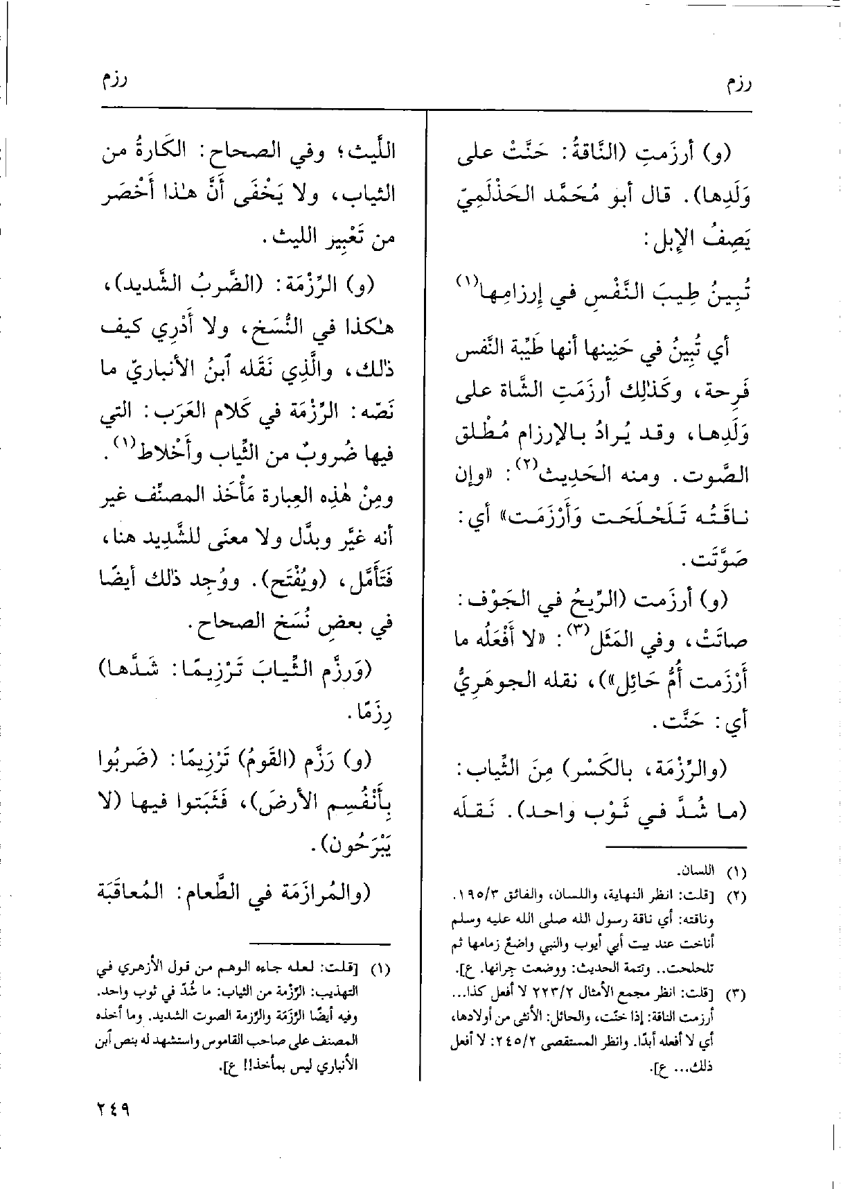 (و) أرزَمتِ (النَّاقةُ: حَنَّتْ على وَلَدِها) . قَالَ أَبُو مُحَمَّد الحَذْلَمِيّ يَصِفُ الإِبل: