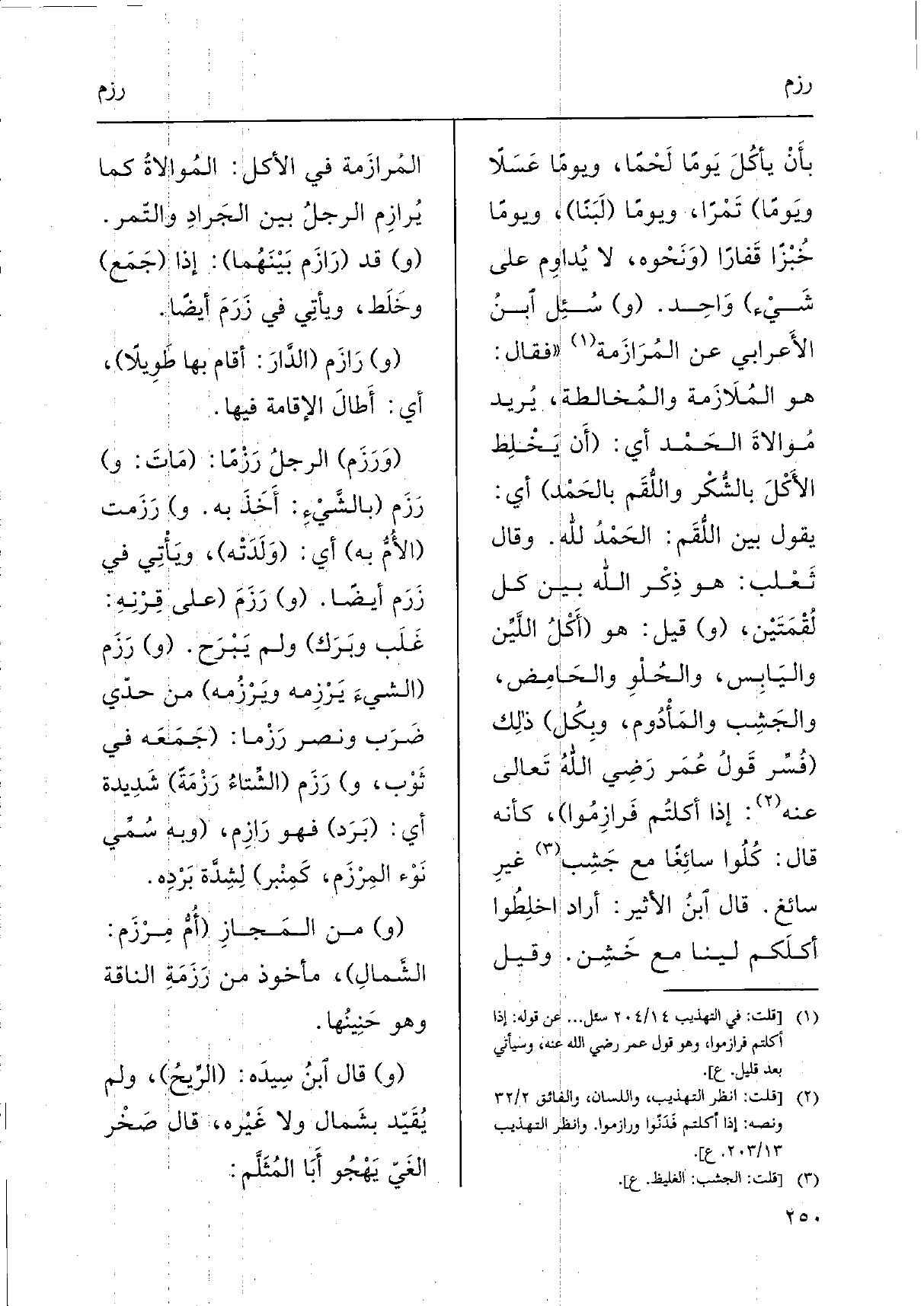 بأَنْ يأكُلَ يَوماً لَحْماً، وَيَوْما عَسَلاً ويَوماً) تَمْراً، وَيَوْما (لَبَناً) ، وَيَوْما خُبْزاً قَفاراً (وَنَحْوه، لَا يُداوِم على شَيْء) وَاحِد. (و) سُئِل اْبنُ الأَعرابي عَن المُرَازَمة " فَقَالَ: هُوَ المُلاَزَمة والمخُالطة، يُريد مُوالاةَ الحَمْد أَي: (أَن يَخْلِط الأَكْلَ بالشُّكْر واللُّقَم بالحَمْد) أَي: يَقُول بَين اللُّقَم: الحَمْدُ لله. وَقَالَ ثَعْلب: هُوَ ذِكْر الله بَين كل لٌ قْمَتَيْن، (و) قيل: هُوَ (أَكْلُ اللَّيِّن واليَابِس، والحُلْوِ والحَامِض، والجَشِب والمَأْدُوم، وبِكُل) ذلِك (فُسِّر قَولُ عُمَر رَضِي الله تَعَالَى عَنهُ: إِذا أكلتُم فَرازِمُوا) ، كَأَنَّهُ قَالَ: كُلُوا سائِغاً مَعَ جَشِب غيرِ سَائِغ. قَالَ اْبنُ الْأَثِير: أَرَادَ اخلِطُوا أكلَكم لينًا مَعَ خَشِن. وَقيل المُرازَمة فِي الْأكل: المُوالاةُ كَمَا يُرازِم الرجلُ بَين الجَرادِ والتّمر. (و) قد (رَازَم بَيْنَهُما) : إِذا (جَمَع) وخَلَط، ويأتِي فِي زَرَمَ أَيْضا.