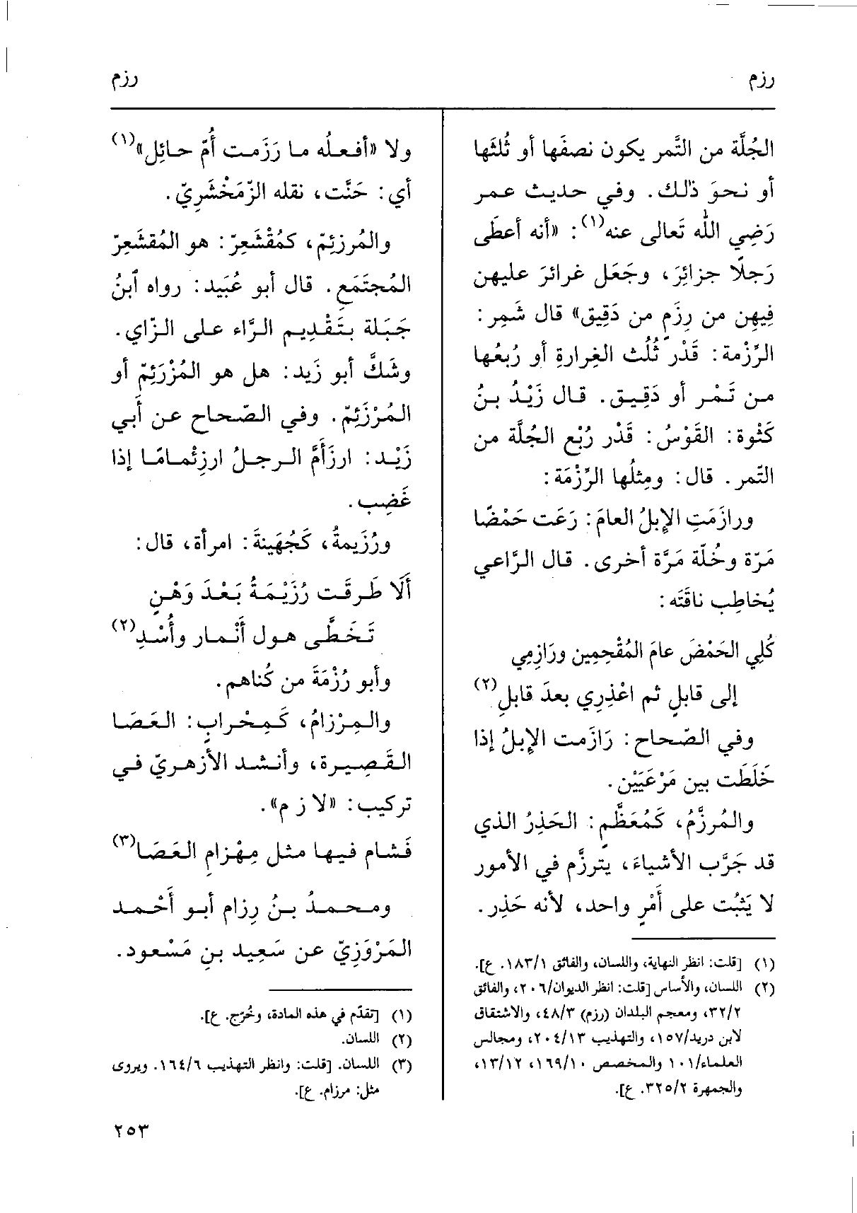 والمُرزَّمُ، كَمُعَظَّمٍ: الحَذِرُ الَّذِي قد جَرَّب الأشياءَ، يَترزَّم فِي الْأُمُور لَا يَثبُت على أَمْرٍ وَاحِد، لِأَنَّهُ حَذِر. وَلَا " أفعلُه مَا رَزَمت أُمّ حائِل " أَي: حَنَّت، نَقله الزّمَخْشَرِيّ.