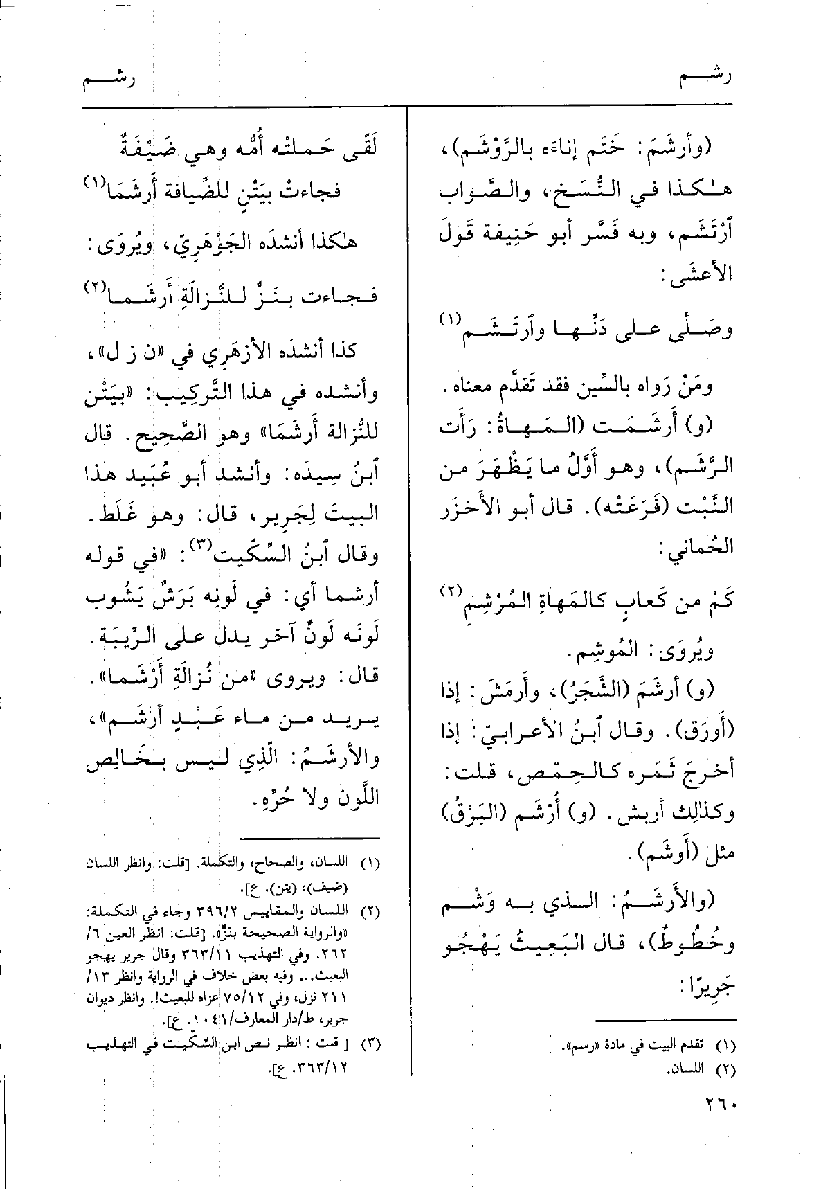 كَذَا أنشدَه الأزهَرِي فِي " ن ز ل "، وأنشده فِي هَذَا التَّركِيب: " بيَتْن للنُّزالة أَرشَمَا " وَهُوَ الصَّحِيح. قَالَ اْبنُ سِيدَه: وَأنْشد أَبُو عُبَيد هَذَا البيتَ لِجَرير، قَالَ: وَهُوَ غَلَط. وَقَالَ اْبنُ السِّكّيت: " فِي قَوْله أرشما أَي: فِي لَونِه بَرَشٌ يَشُوب لَونَه لَونٌ آخر يدل على الرَّيبَة. قَالَ: ويروى " من نُزالَةِ أَرْشَما ". يُرِيد من مَاء عَبْدٍ أرشَم "، والأرشَمُ: الّذِي لَيْسَ بخَالِص اللَّون وَلَا حُرِّهِ.