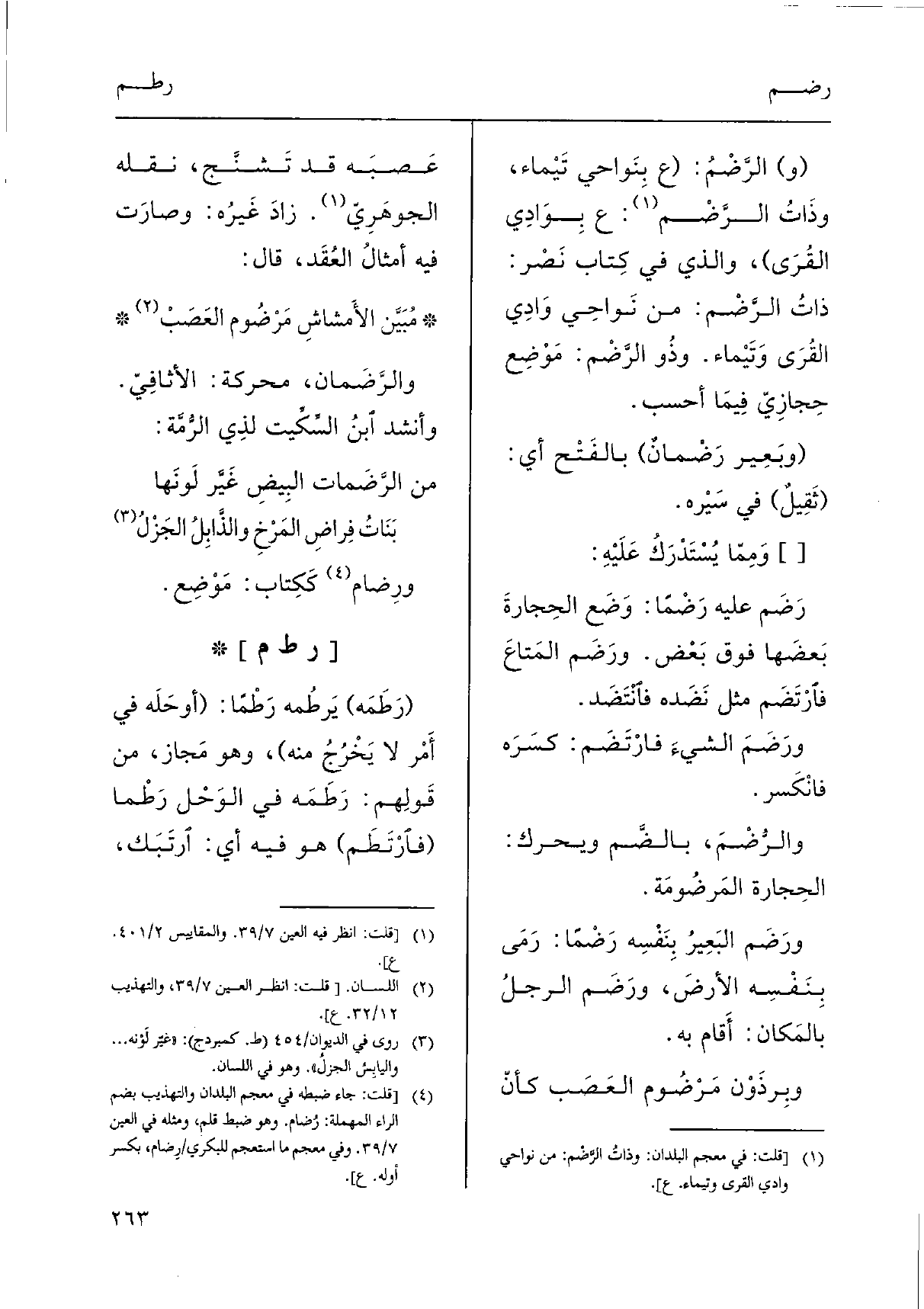 (و) الرَّضْمُ: (ع بِنَواحي تَيْماء، وذَاتُ الرَّضْم: ع بِوَادِي القُرى) ، وَالَّذِي فِي كِتاب نَصْر: ذاتُ الرَّضْم: من نَواحِي وَادِي القُرَى وَتَيْماء. وذُو الرَّضْم: مَوْضِع حِجازِيّ فِيمَا أَحسب.