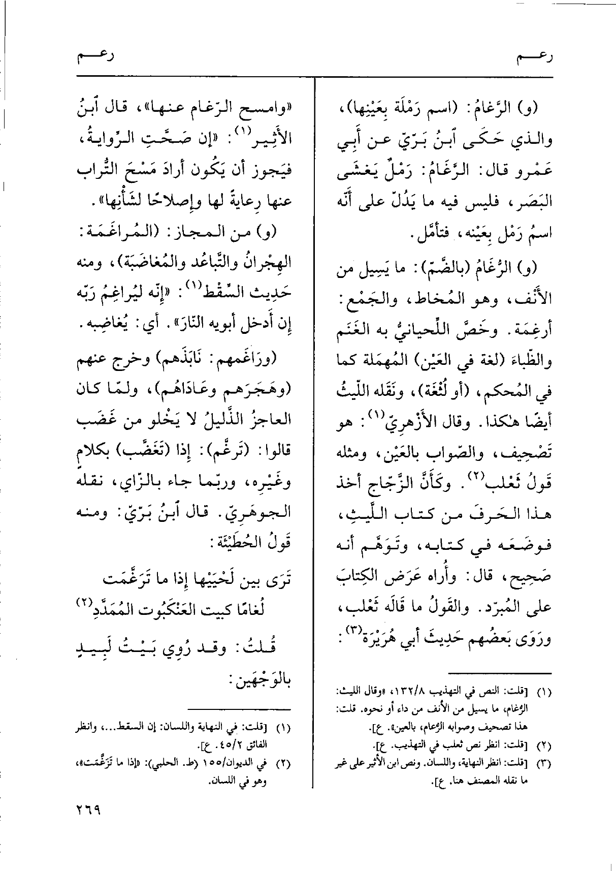 (و) الرُّغَامُ (بالضَّمَ) : مَا يَسِيل من الأَنْف، وَهُوَ المُخاط، والجمْع: أرغِمَة. وخَصَّ اللِّحيانيُّ بِهِ الغَنَم والظّباءَ (لُغَة فِي العَيْن) المُهْمَلة كَمَا فِي المُحكم، (أَو لُثْغَة) ، ونَقَله اللّيثُ أَيْضا هَكَذَا. وَقَالَ الأَزْهَرِيّ: هُوَ تَصْحِيف، والصّواب بالعَيْن، وَمثله قَولُ ثَعْلب. وكَأَنَّ الزَّجّاج أَخذ هَذَا الحَرفَ من كتاب اللَّيثِ، فوضَعَه فِي كِتَابه، وتَوَهَّم أَنه صَحِيح، قَالَ: وأُراه عَرَض الكِتابَ على المُبرّد. والقَولُ مَا قَالَه ثَعْلب، ورَوَى بَعضُهم حَدِيثَ أبي هَرَيْرَة: " وامسح الرّغام عَنْهَا "، قَالَ ابنُ الأَثِير: " إِن صَحَّتِ الرِّوايةُ، فيَجوز أَن يَكُون أرادَ مَسْحَ التُّراب عَنْهَا رِعايةً لَهَا وإِصلاحًا لشَأْنِها ".