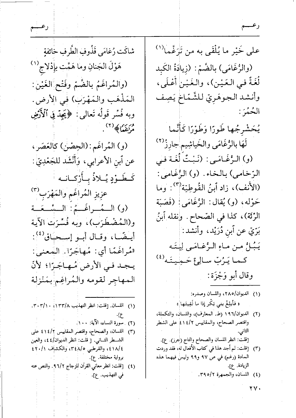 (و) المُراغَمُ: السِّعَة و (المُضْطَرَب) ، وَبِه فُسِّرت الْآيَة أَيْضا، وَقَالَ أَبُو إِسْحَاق: " مُراغَمًا أَي: مُهاجَرًا. الْمَعْنى: يجد فِي الأَرْض مُهاجَرًا؛ لأنّ المهاجِر لِقَوْمِهِ والمُراغِم بمَنْزلة