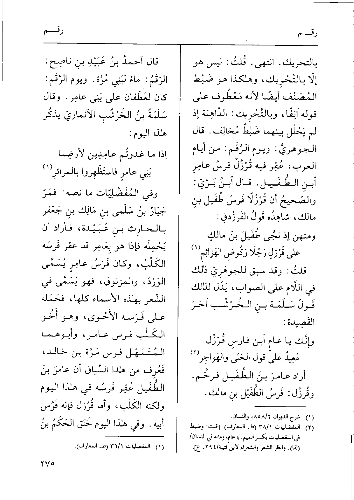بِالتَّحْرِيكِ. انْتهى. قُلتُ: لَيْسَ هُوَ إلاّ بالتَّحْرِيك، وَهَكَذَا هُوَ ضَبْط المُصَنِّف أَيْضا لِأَنَّهُ مَعْطُوف على قَوْله آنِفاً، وبالتَّحْرِيك: الدَّاهِيَة إِذْ لم يَحْلُل بَينهمَا ضَبْطٌ مُخالِف. قَالَ الجوهريُّ: وَيَوْم الرَّقْم: من أَيَّام الْعَرَب، عُقِر فِيهِ قُرْزُلٌ فرسُ عامِرِ ابنِ الطُّفَيل. قَالَ اْبنُ بَرّيّ: والصّحيحُ أَن قُرْزُلاً فَرسُ طُفَيل بنِ مَالك، شاهِدُه قَولُ الفَرزْدقِ.