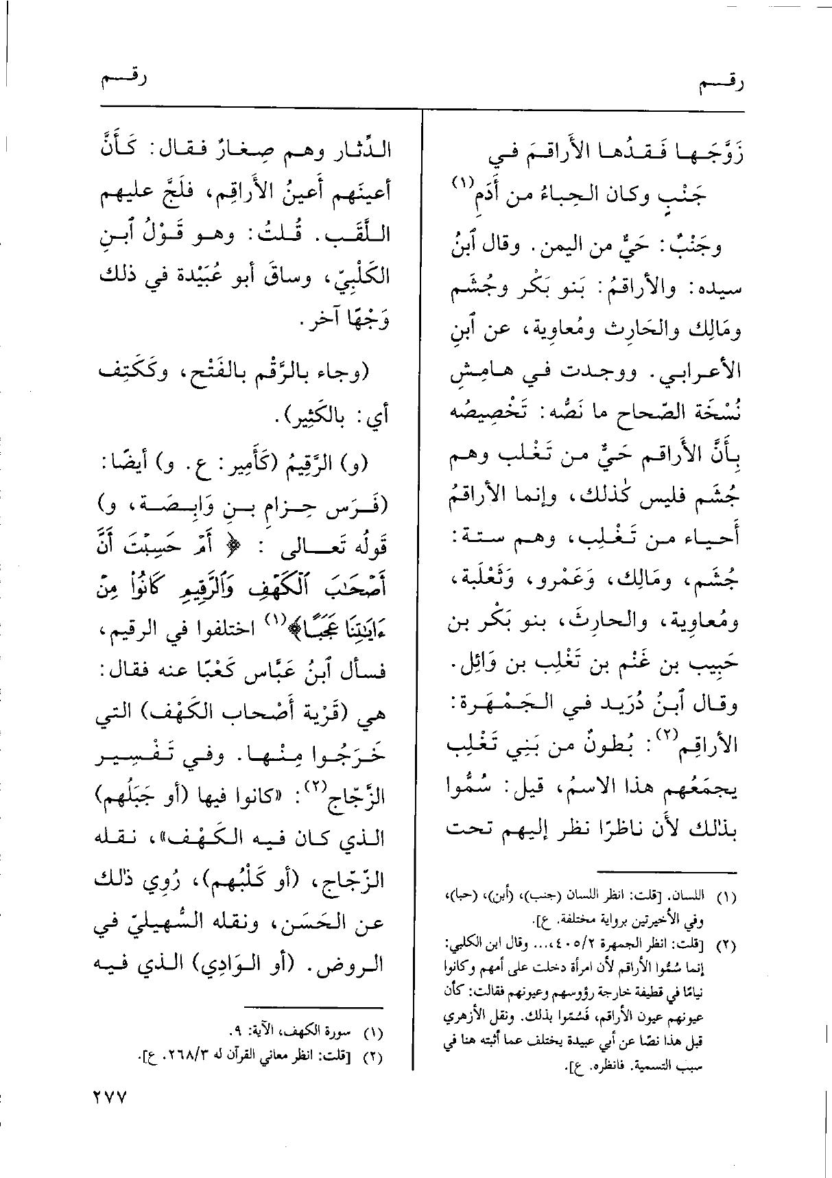 (و) الرَّقِيمُ (كَأَمِير: ع. و) أَيْضا: (فَرَس حِزامِ بنِ وَابِصَة، و) قَولُه تَعالى: {أَمْ حَسِبْتَ أَنَّ أَصْحَابَ اْلكَهْفِ وَالْرَّقِيمِ كَانُواْ مِنْءَايَتِنَا عَجَباً} اخْتلفُوا فِي الرقيم، فَسَأَلَ اْبنُ عَبَّاس كَعْباً عَنهُ فَقَالَ: هِيَ (قَرْية أَصْحاب الكَهْف) الَّتِي خَرَجُوا مِنْها. وَفِي تَفْسِير الزَّجّاج: " كَانُوا فِيهَا (أَو جَبَلُهم) الَّذِي كَانَ فِيهِ الكَهْف "، نَقله الزّجّاج، (أَو كَلْبُهم) ، رُوِي ذَلِك عَن الحَسَن، وَنَقله السُّهيليّ فِي الرَّوْض. (أَو الوَادِي) الَّذِي فِيهِ