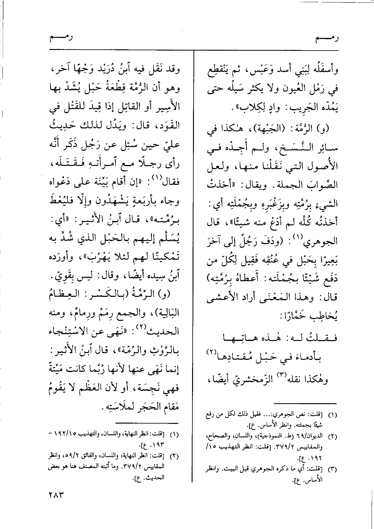 وَهَكَذَا نَقله الزّمخشريّ أَيْضا، وَقد نَقَل فِيهِ ابنُ دُرَيْد وَجْهًا آخر، وَهُوَ أَن الرُّمَّة قِطْعَةُ حَبْل يُشَدّ بهَا الأَسِير أَو القاتِل إِذا قِيدَ للقَتْل فِي القَوَد، قَالَ: ويَدُل ذَلِك حَدِيثُ عليّ حِين سُئِل عَن رَجُل ذَكَر أَنَّه رأى رجلا مَعَ امرأَتهِ فَقَتَلَه، فَقَالَ: " إِن أَقَامَ بَيِّنَة على دَعْواه وَجَاء بأربَعةٍ يَشْهَدُون وإلاّ فليُعْطَ برُمَّته "، قَالَ ابنُ الأَثير: " أَي: يُسَلَّم إِلَيْهِم بالحَبْل الَّذِي شُدّ بِهِ تَمْكيناً لَهُم لِئَلَّا يَهْرُبَ "، وأورَده ابنُ سِيده أَيْضا، وَقَالَ: لَيْسَ بِقَوِيّ.