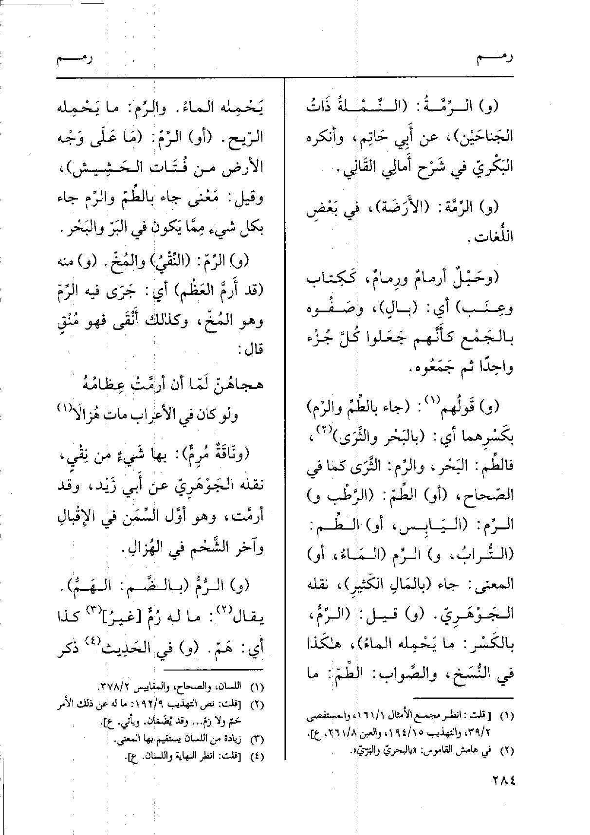 (و) الرِّمّ: (النِّقْيُ) والمُخّ. (و) مِنْهُ (قد {أَرمَّ العَظْم) أَي: جَرَى فِيهِ الرِّمّ وَهُوَ المُخّ، وَكَذَلِكَ أَنْقَى فَهُوَ مُنْقٍ قَالَ: